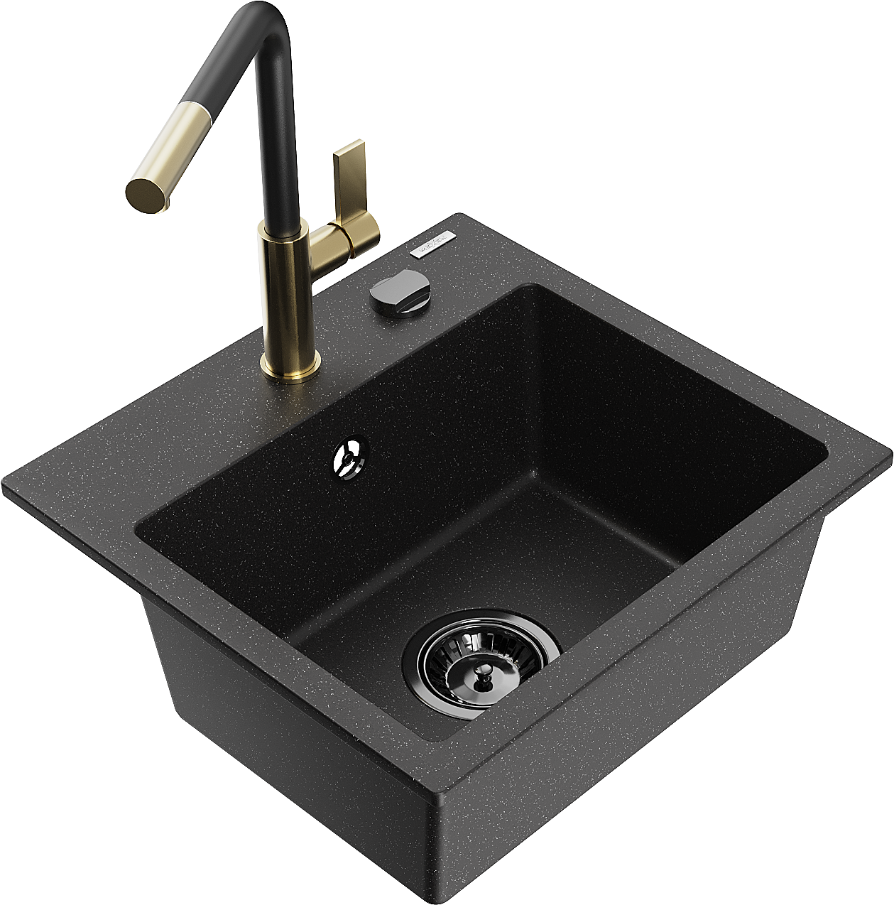 Mexen Milo žulový drez s 1 komorou a kuchynskou batériou Flora, čierna/strieborný metalický - 6505-73-670401-57-B