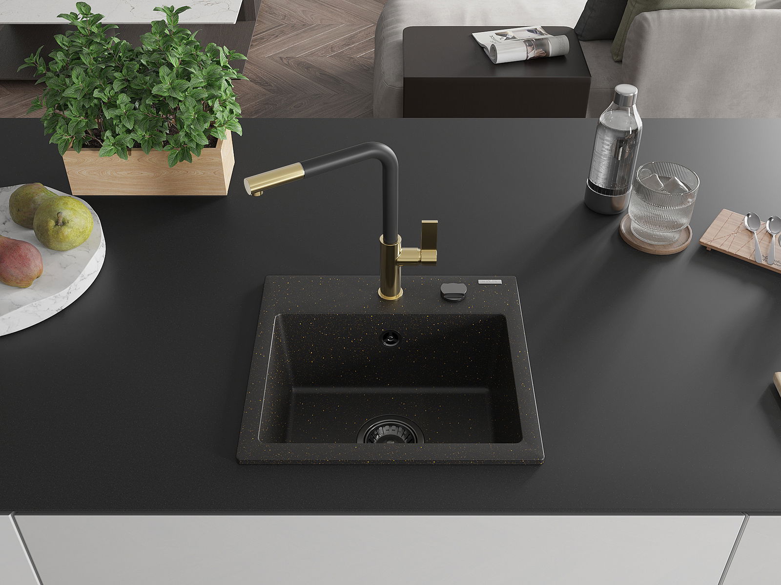 Mexen Milo granitový kuchynský drez 1-komorový s kuchynskou batériou Flora, čierny/zlatý metalík - 6505-75-670401-57-B