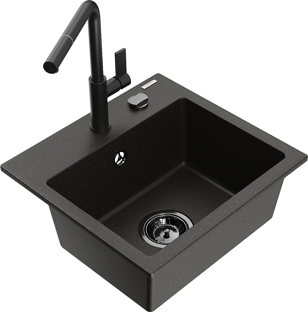 Mexen Milo žulový drez s 1 komorou a kuchynskou batériou Flora, čierny/zlatý metalik - 6505-75-670401-70-B