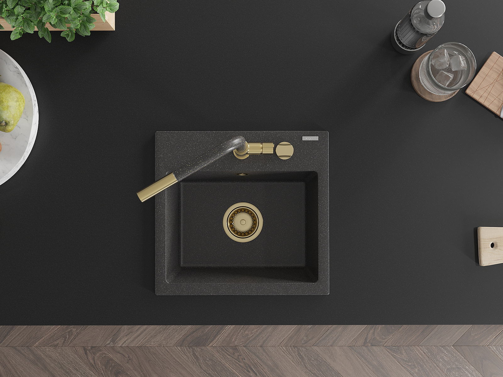 Mexen Milo granitový drez 1-komorový s kuchynskou batériou Flora, čierny s fŕkaním - 6505-76-670401-75-G