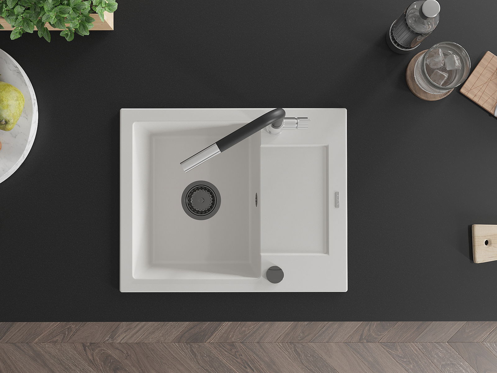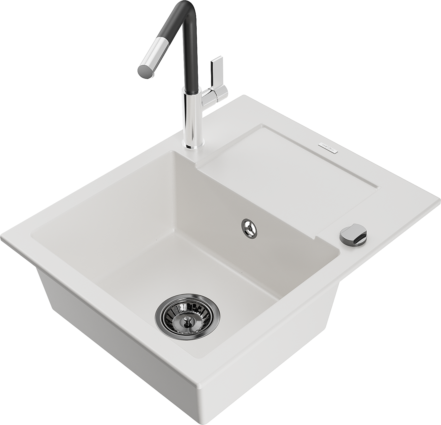 Mexen Enzo granitový drez s 1 komorou, odkvapkávačom a kuchynskou batériou Flora, biela - 6506-20-670401-07-B