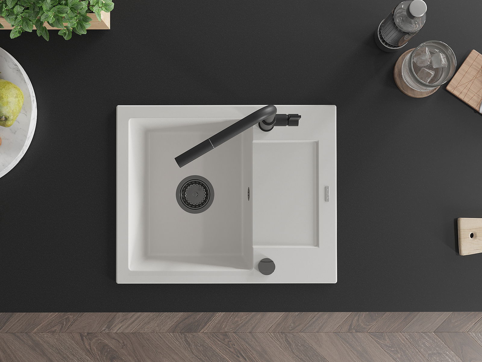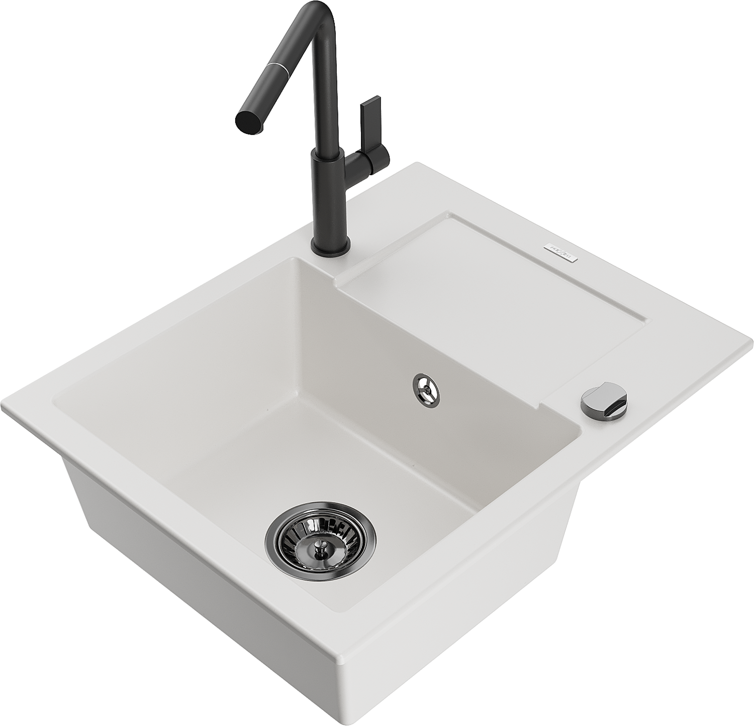 Mexen Enzo granitový drez s jednou komorou s odkvapkávačom a kuchynskou batériou Flora, biely - 6506-20-670401-70-B