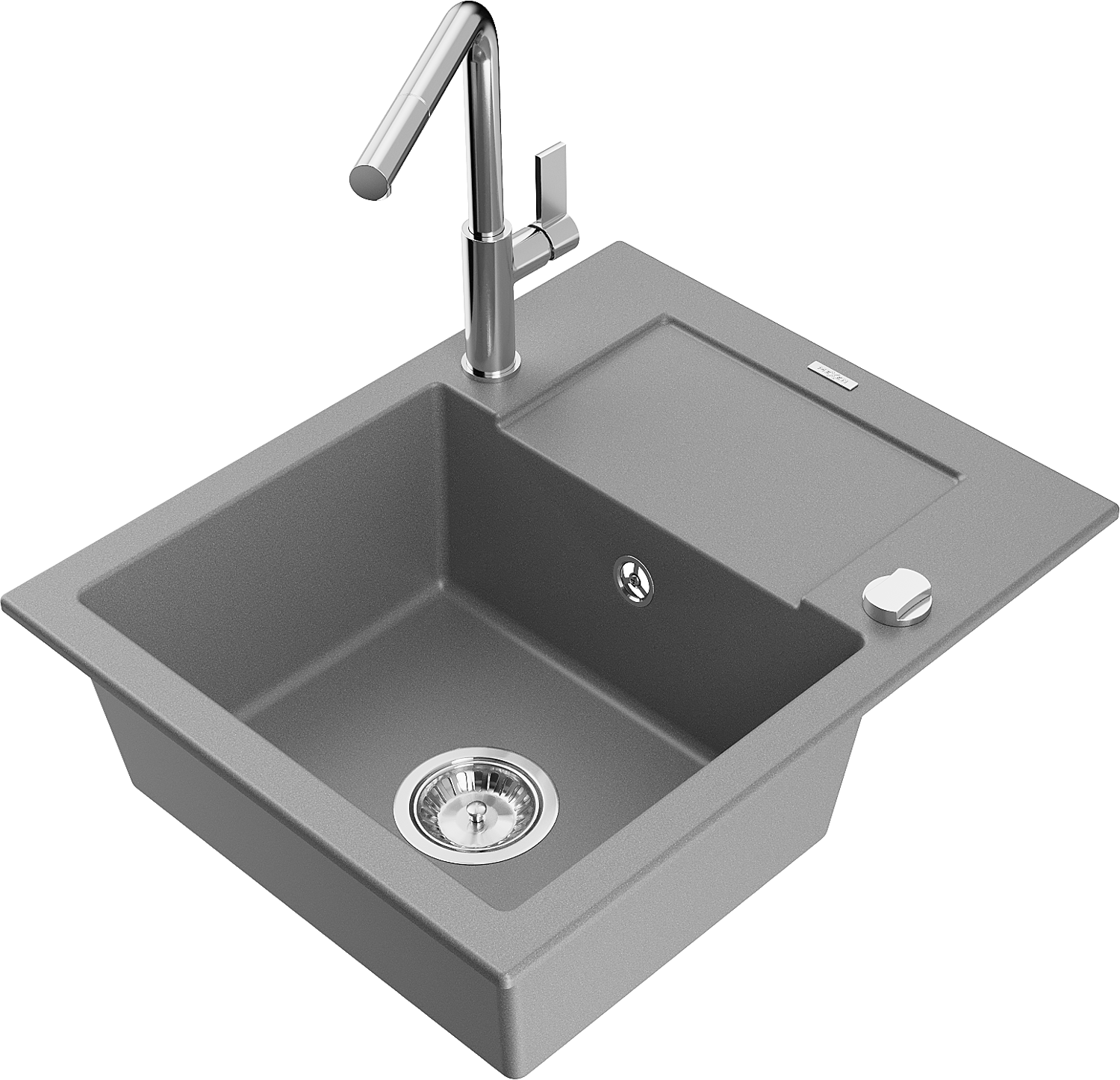 Mexen Enzo granitový kuchynský drez s 1 komorou a odkvapkávačom a kuchynská batéria Flora, sivý - 6506-71-670401-00