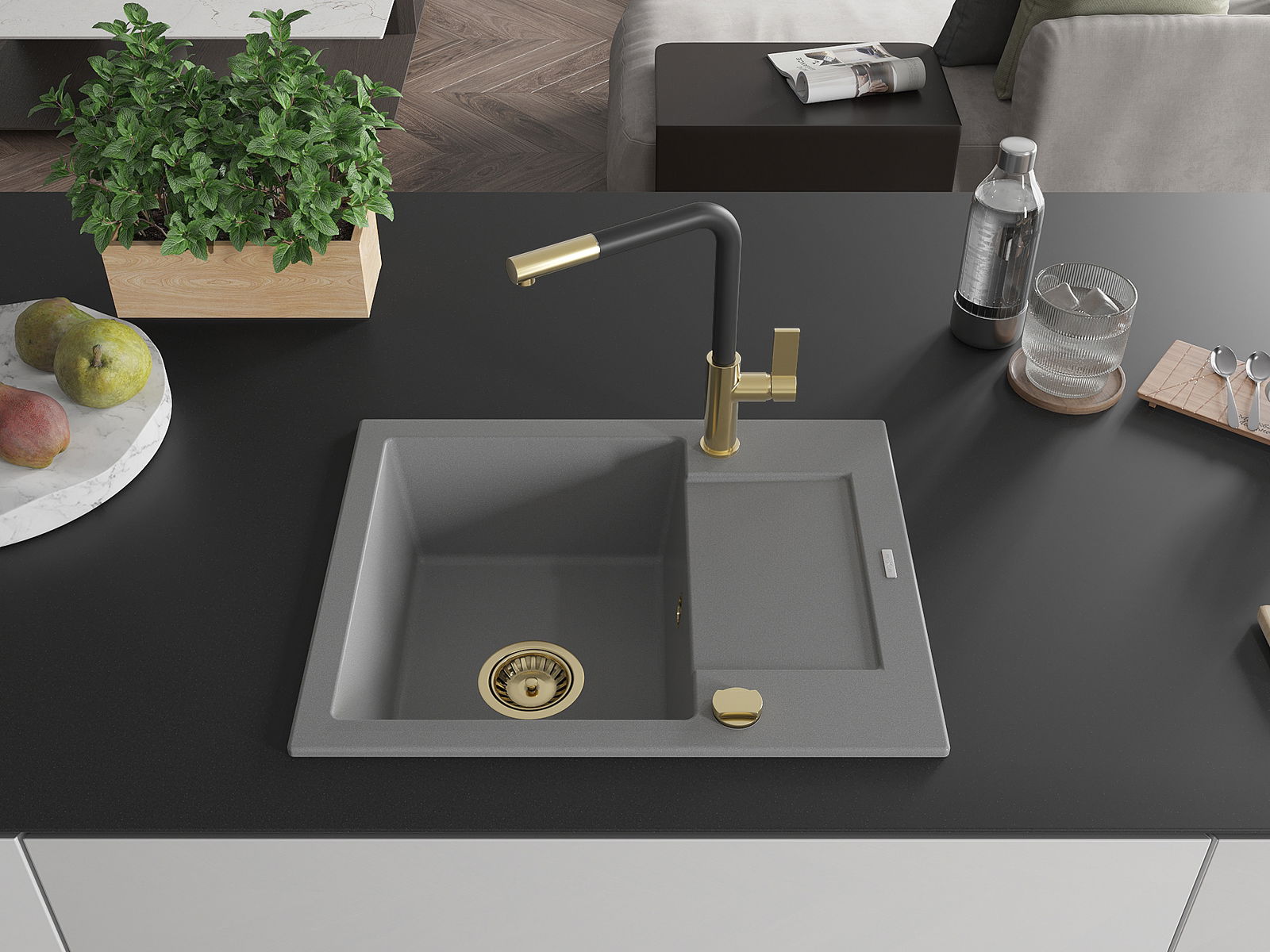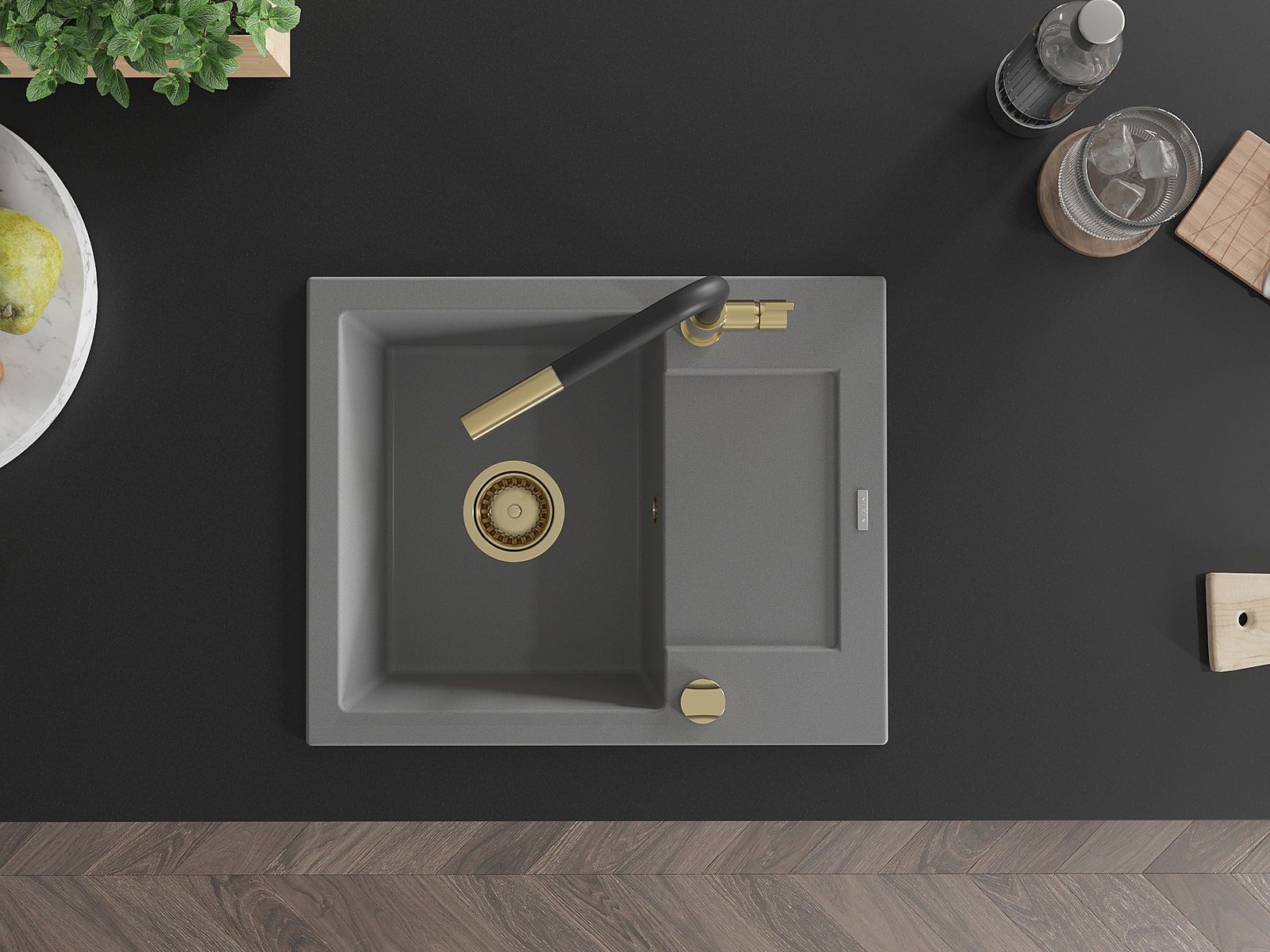 Mexen Enzo granitový drez 1-komorový s odkvapkávačom a kuchynskou batériou Flora, sivý - 6506-71-670401-57-G