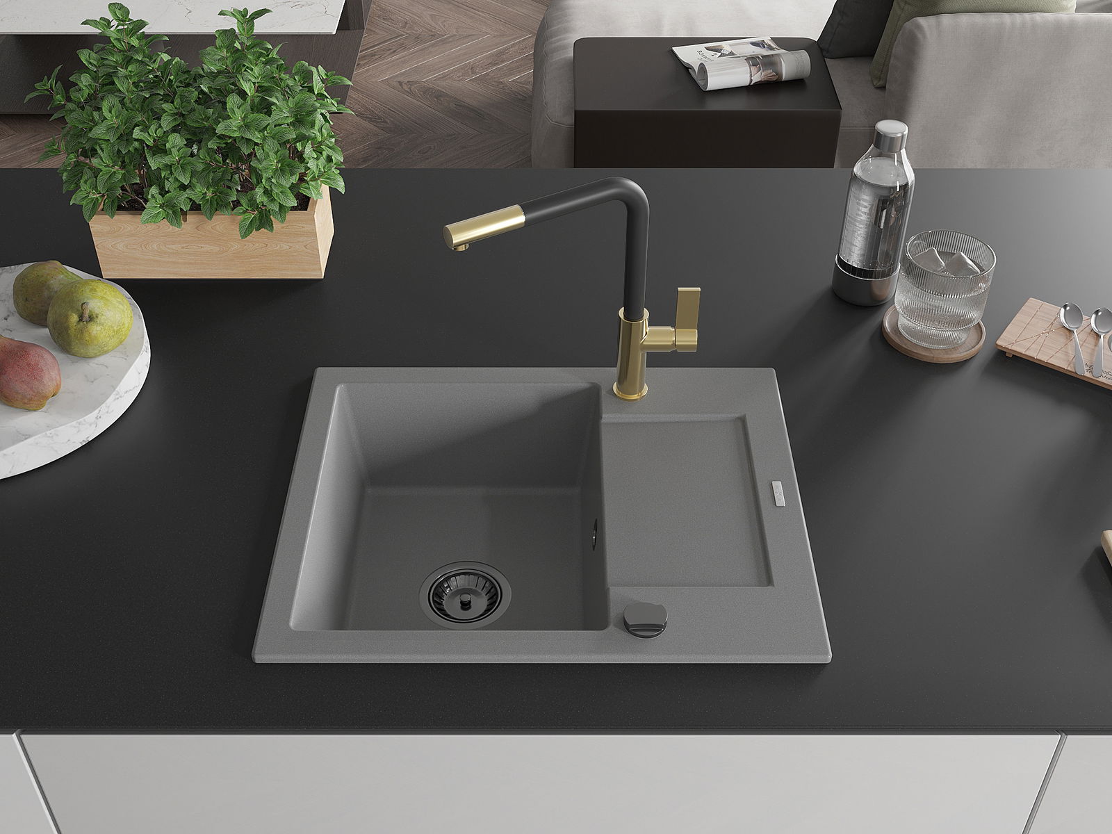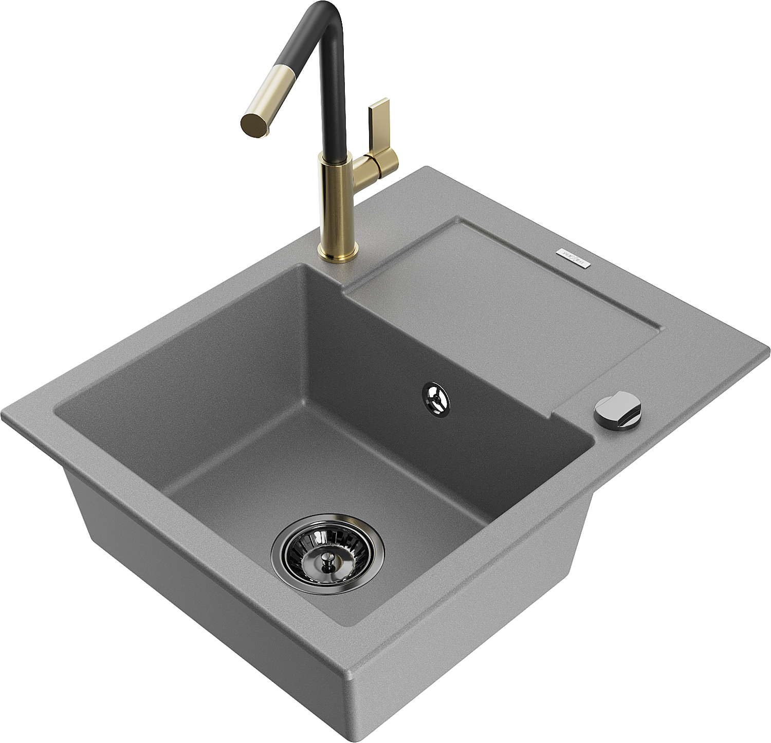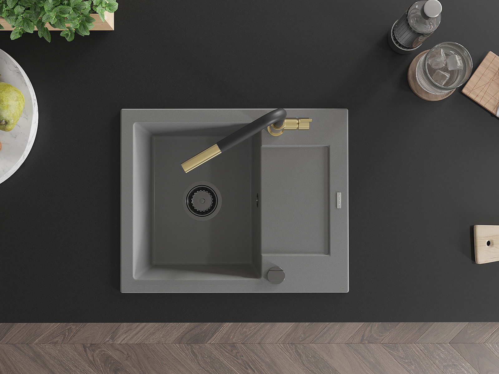 Mexen Enzo jednokomorový žulový drez s odkvapkávačom a kuchynskou batériou Flora, sivý - 6506-71-670401-57-B
