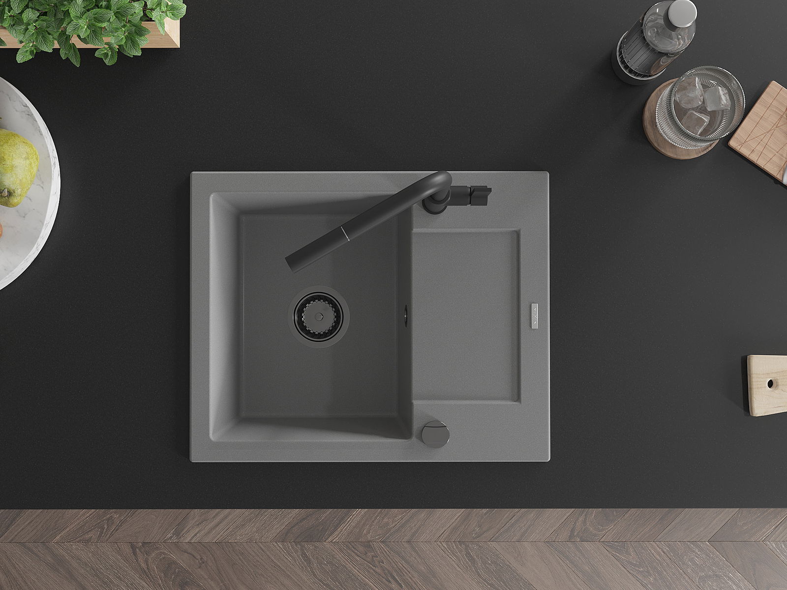 Mexen Enzo granitový drez 1-komorový s odkvapkávačom a kuchynskou batériou Flora, šedý - 6506-71-670401-70-B