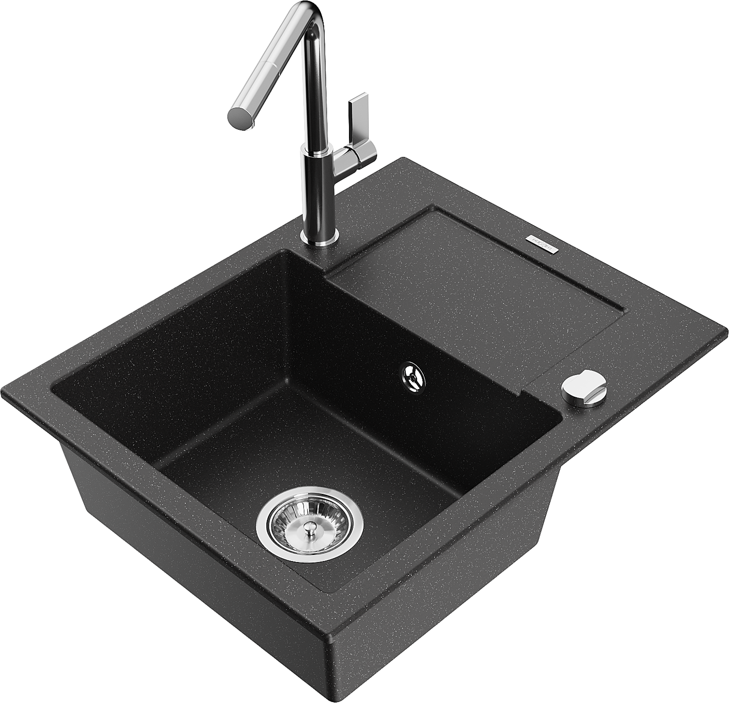 Mexen Enzo granitový drez 1-komorový s odkvapkávačom a kuchynskou batériou Flora, čierny/strieborný metalik - 6506-73-670401-00