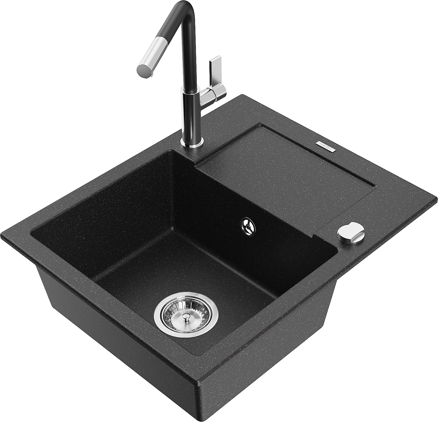 Mexen Enzo granitový drez s 1 komorou, odkvapkávačom a kuchynskou batériou Flora, čierny/strieborný metalický - 6506-73-670401-?