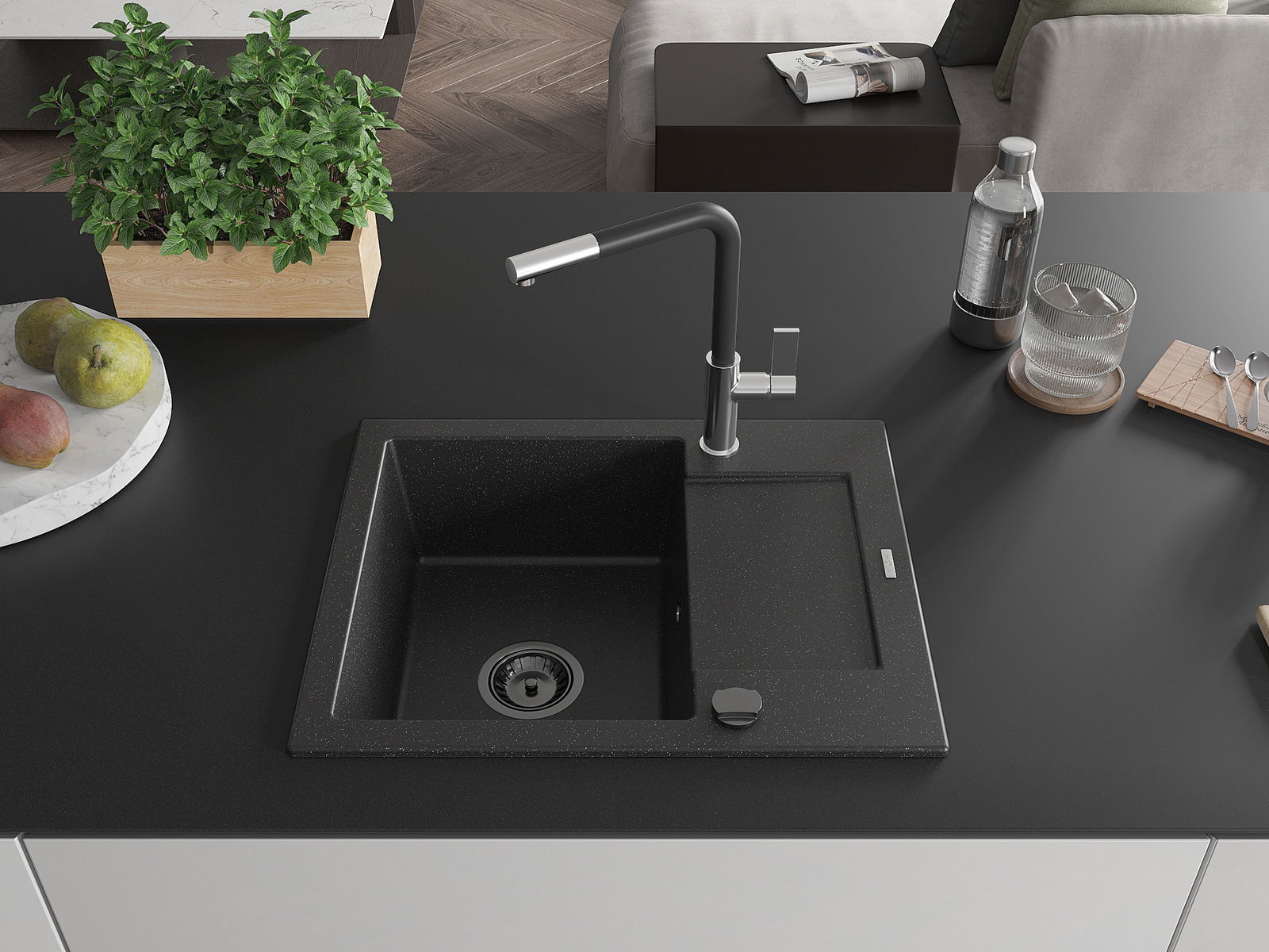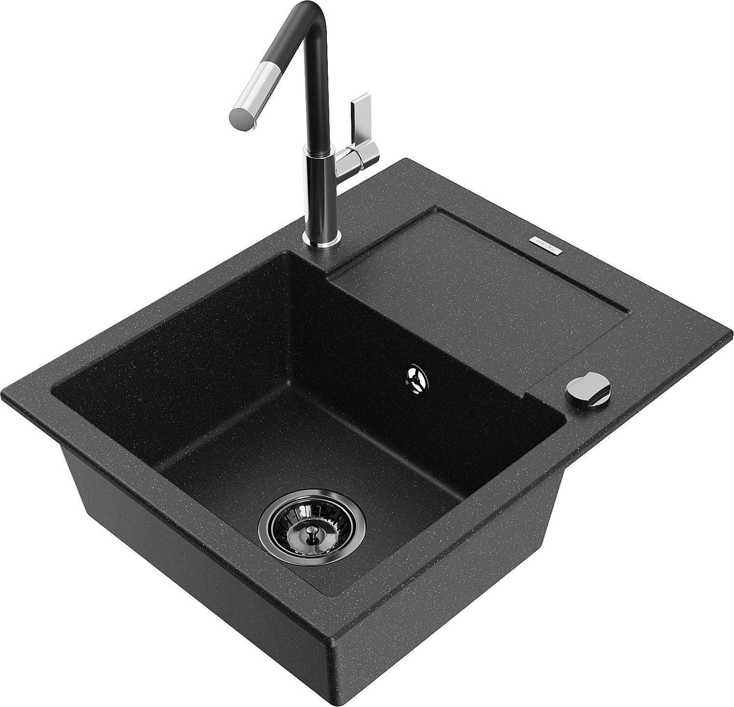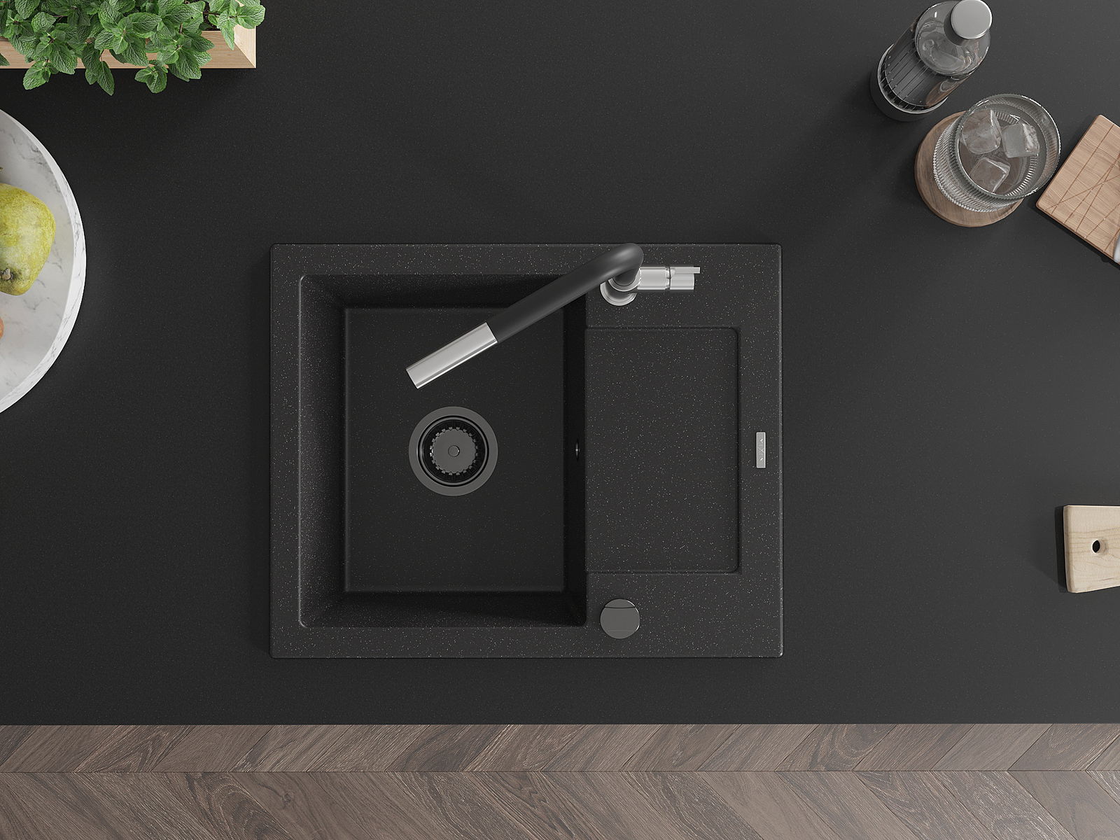 Mexen Enzo granitový kuchynský drez s 1 komorou, odkvapkávacou plochou a kuchynskou batériou Flora, čierny/strieborný