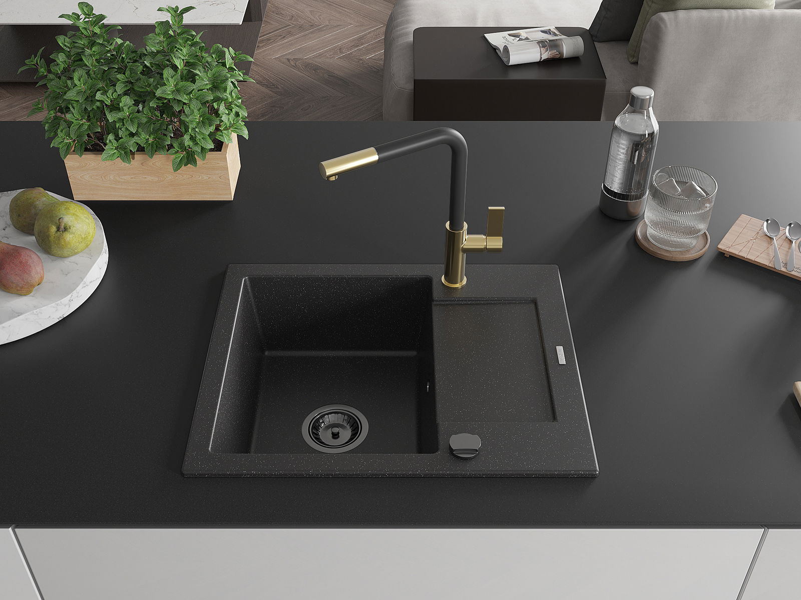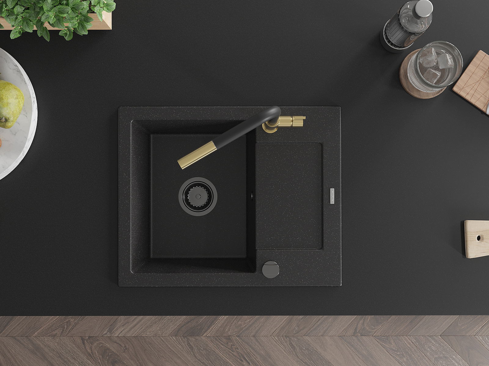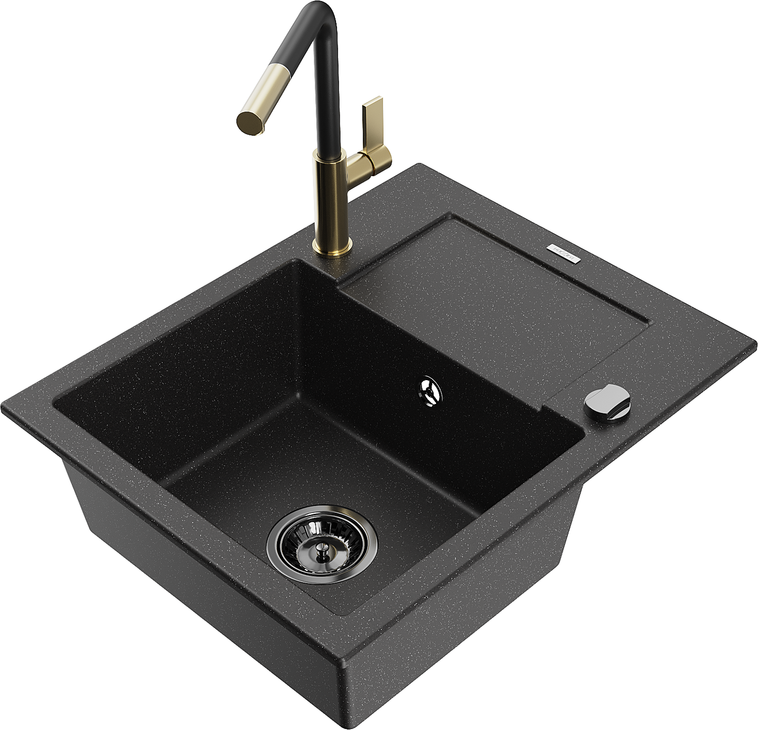 Mexen Enzo jednokomorový žulový drez s odkvapkávačom a kuchynskou batériou Flora, čierny/strieborný metalik - 6506-73-670401-57?