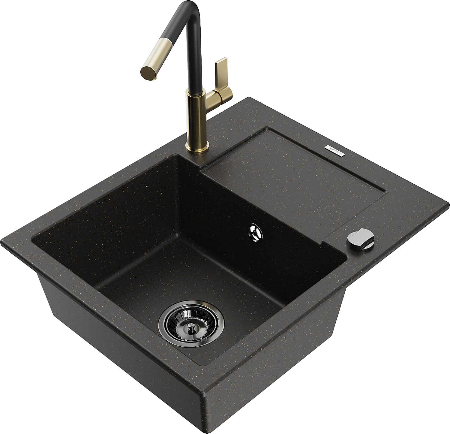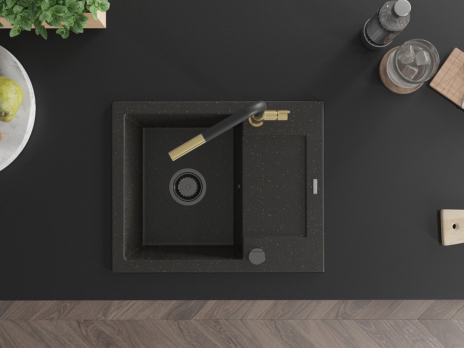 Mexen Enzo granitový kuchynský drez s 1-komorou s odkvapkávačom a kuchynskou batériou Flora, čierny/zlatý metalický