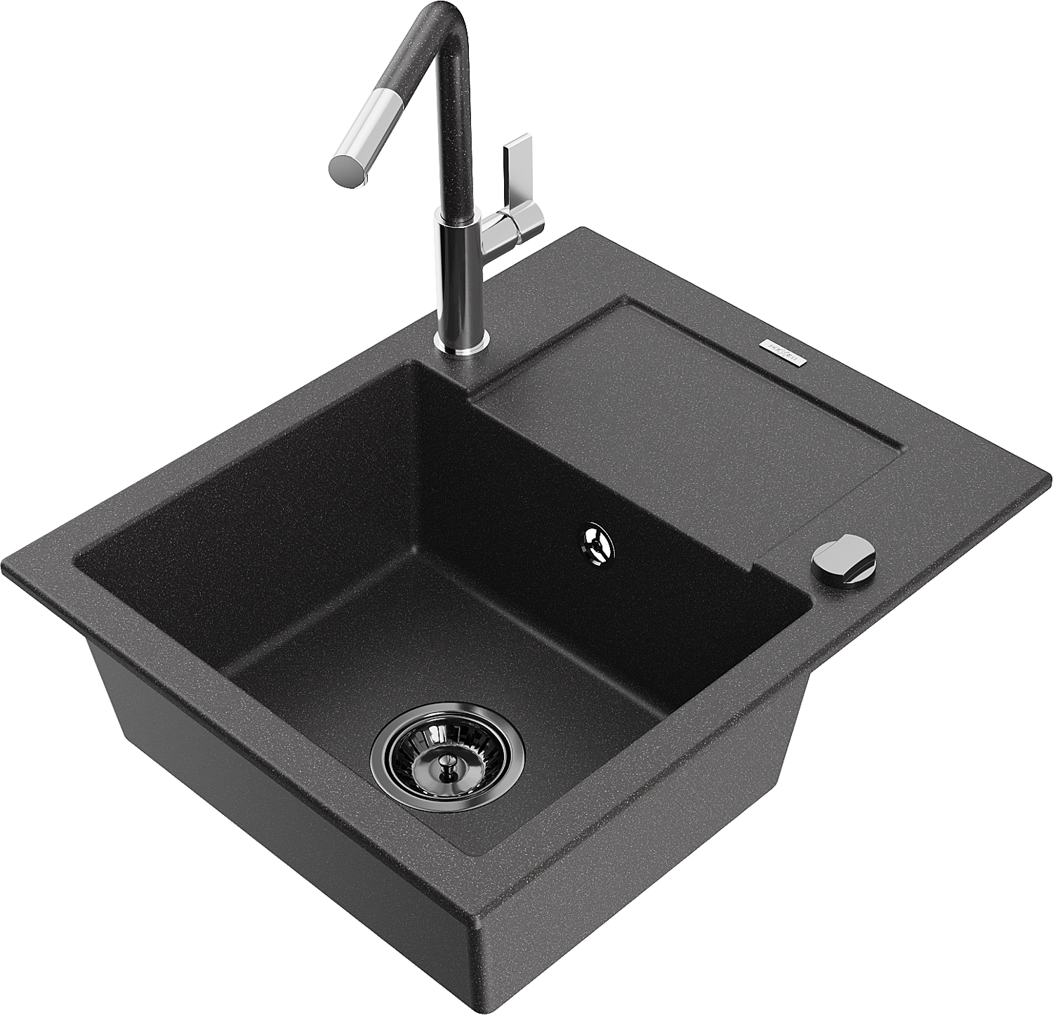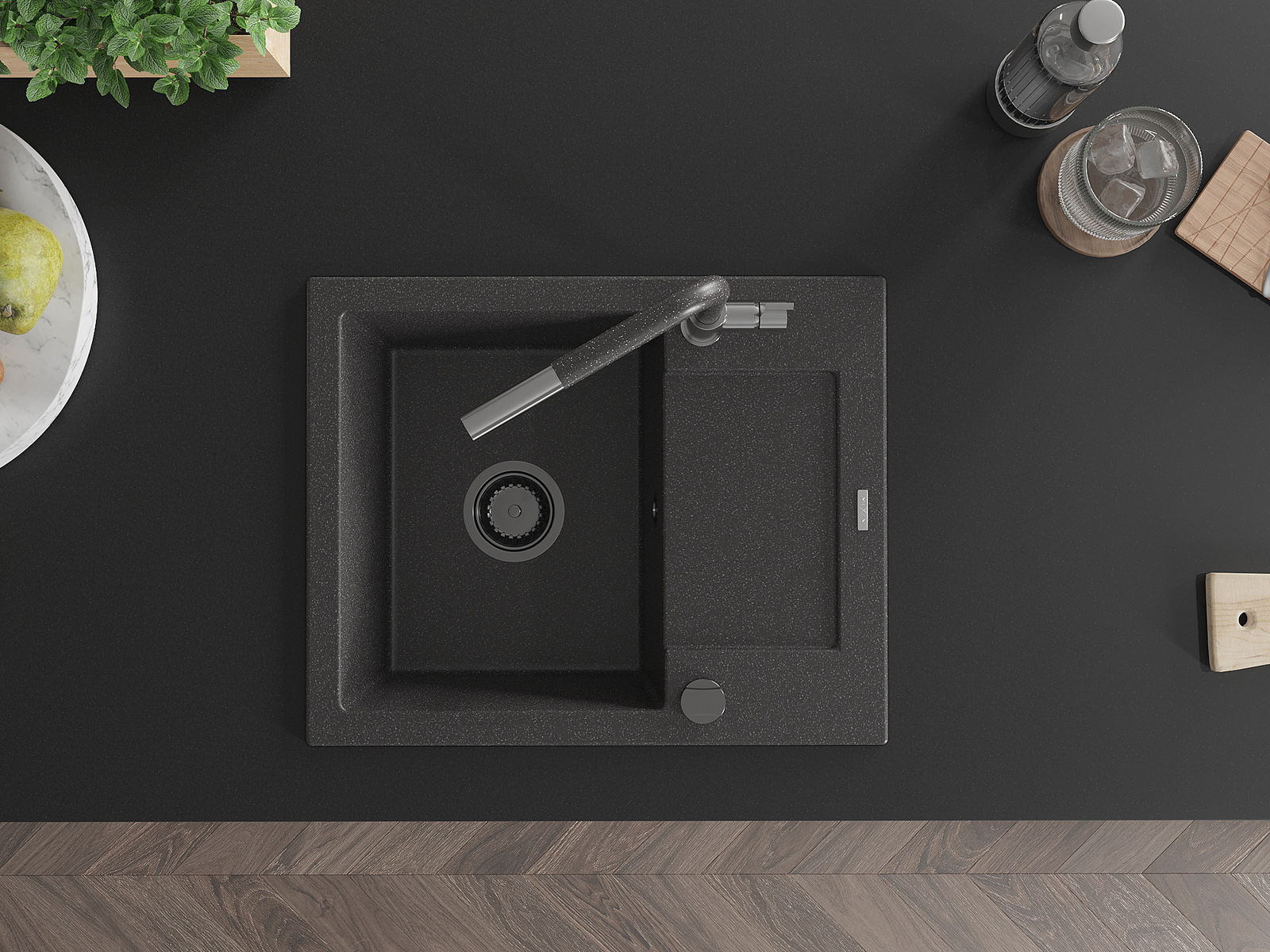 Mexen Enzo granitový jednodrez s odkvapkávačom a kuchynskou batériou Flora, čierny bodkovaný - 6506-76-670401-08-B