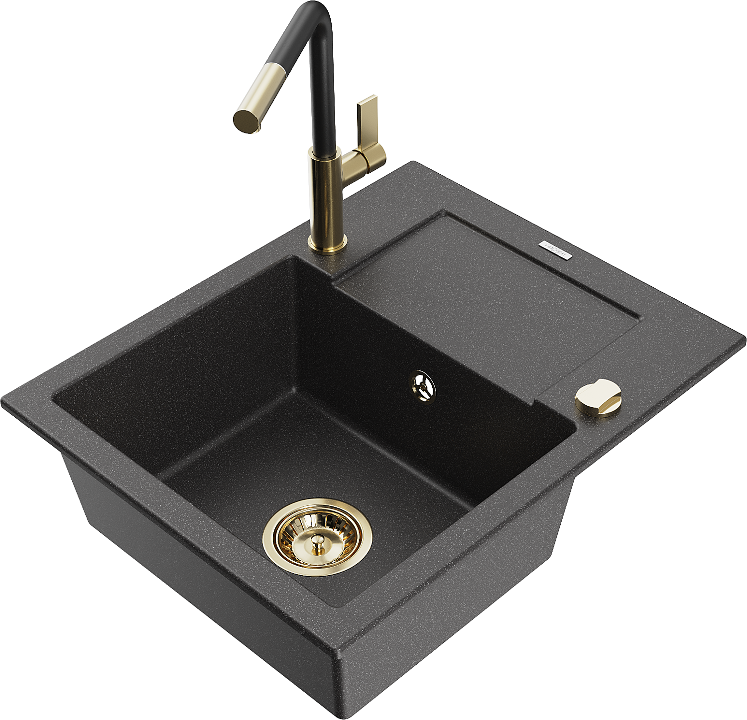 Mexen Enzo granitový drez s 1 komorou s odkvapkávačom a kuchynskou batériou Flora, čierny s bodkami - 6506-76-670401-57-G