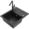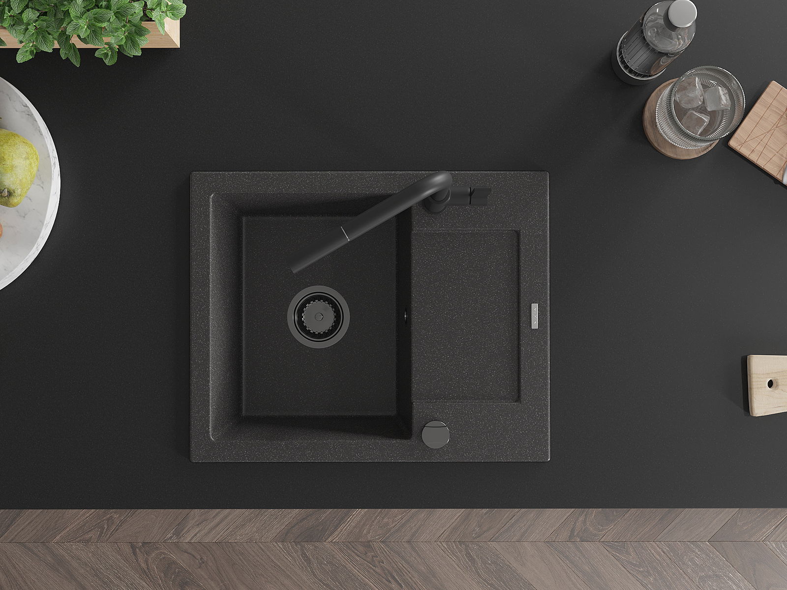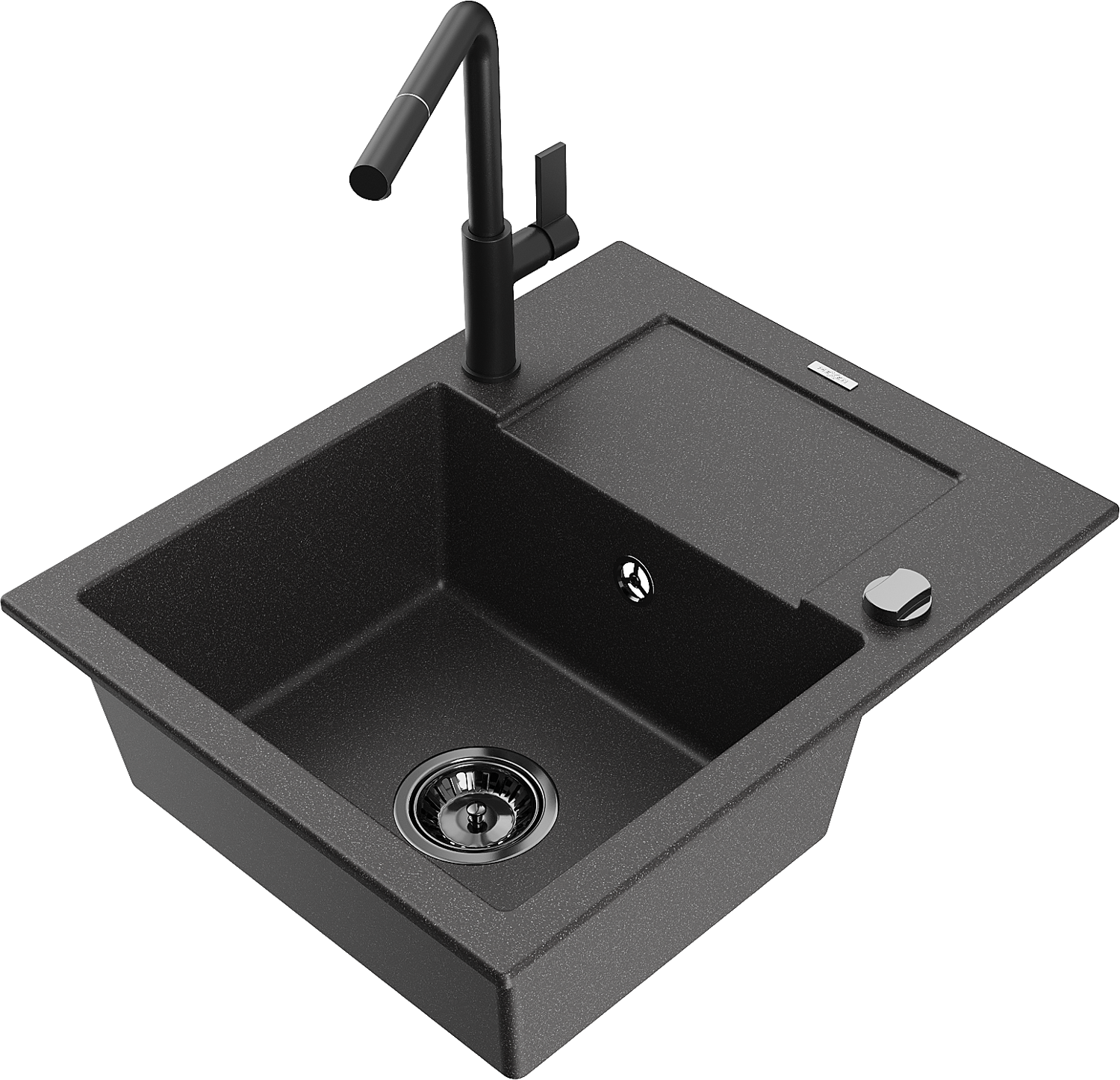 Mexen Enzo granitový kuchynský drez s 1 komorou, odkvapkávačom a kuchynskou batériou Flora, čierny s bodkami