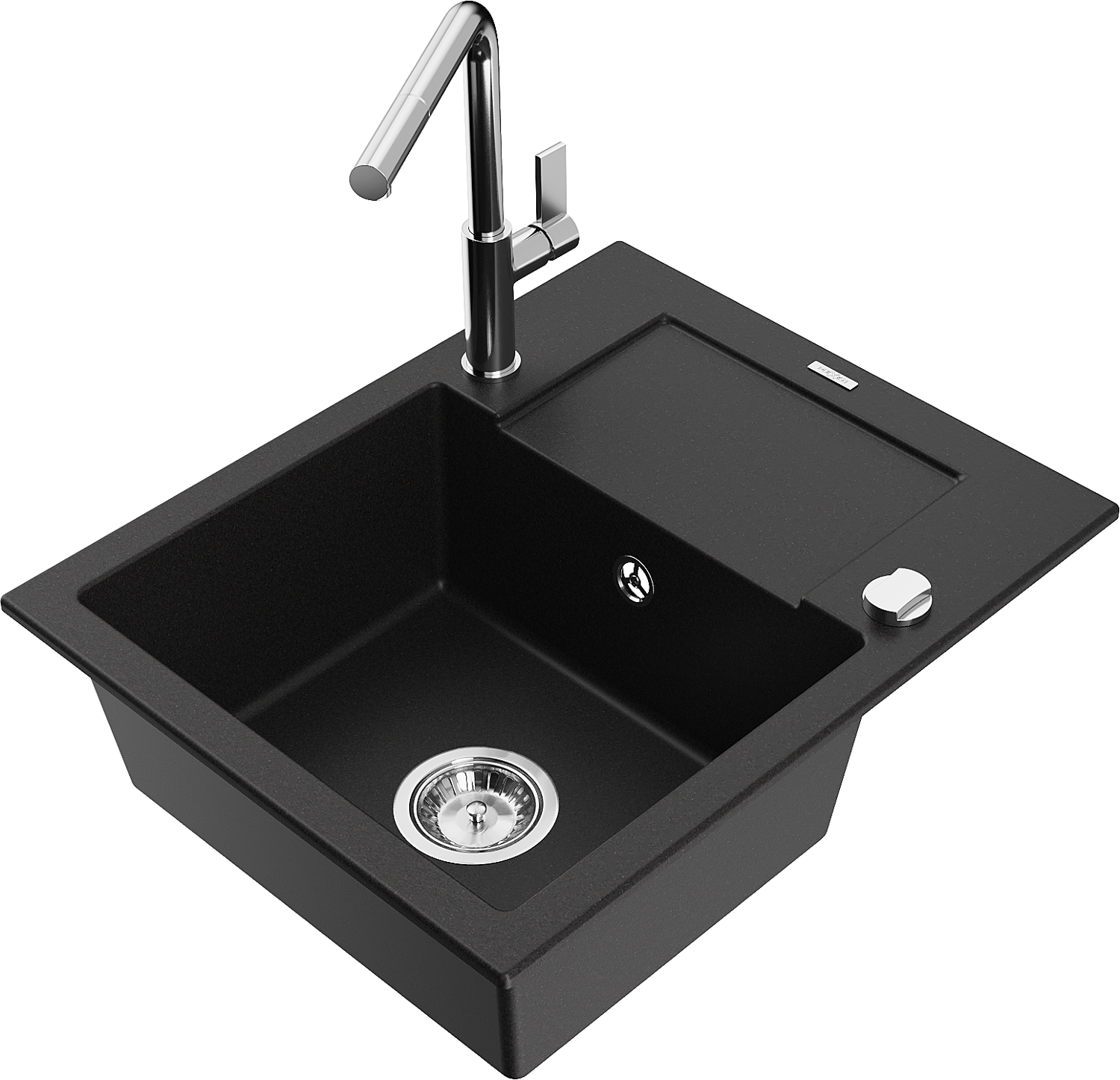 Mexen Enzo žulový drez s 1 komorou s odkvapkávačom a kuchynskou batériou Flora, čierny - 6506-77-670401-00