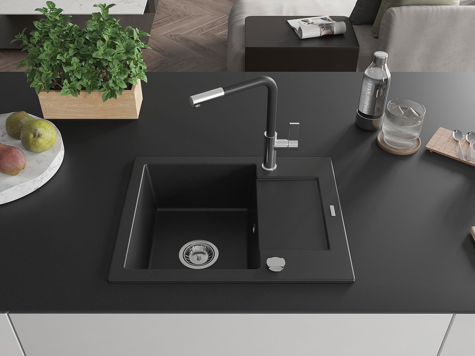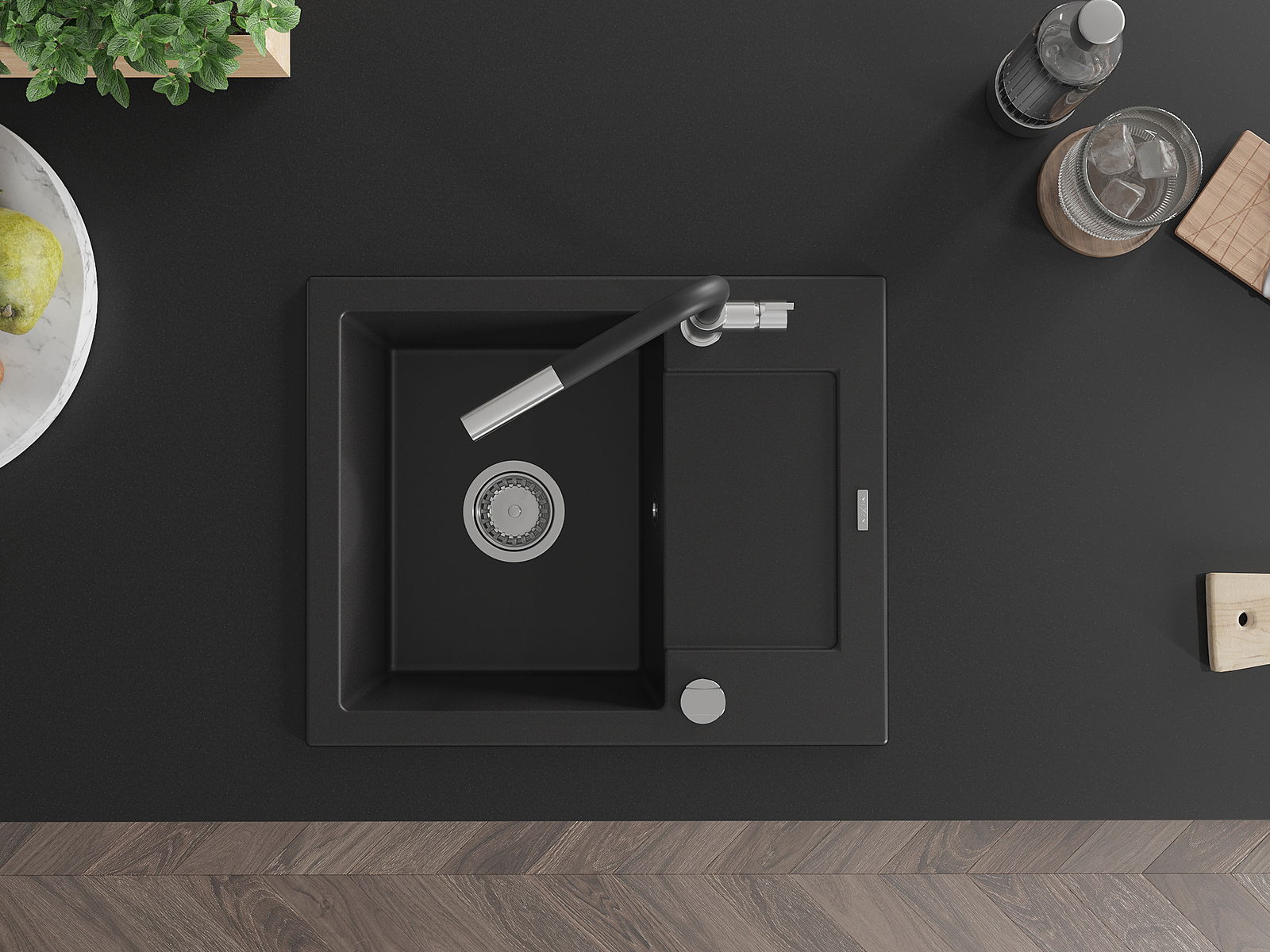 Mexen Enzo granitový drez s 1 komorou s odkvapkávačom a kuchynskou batériou Flora, čierny - 6506-77-670401-07