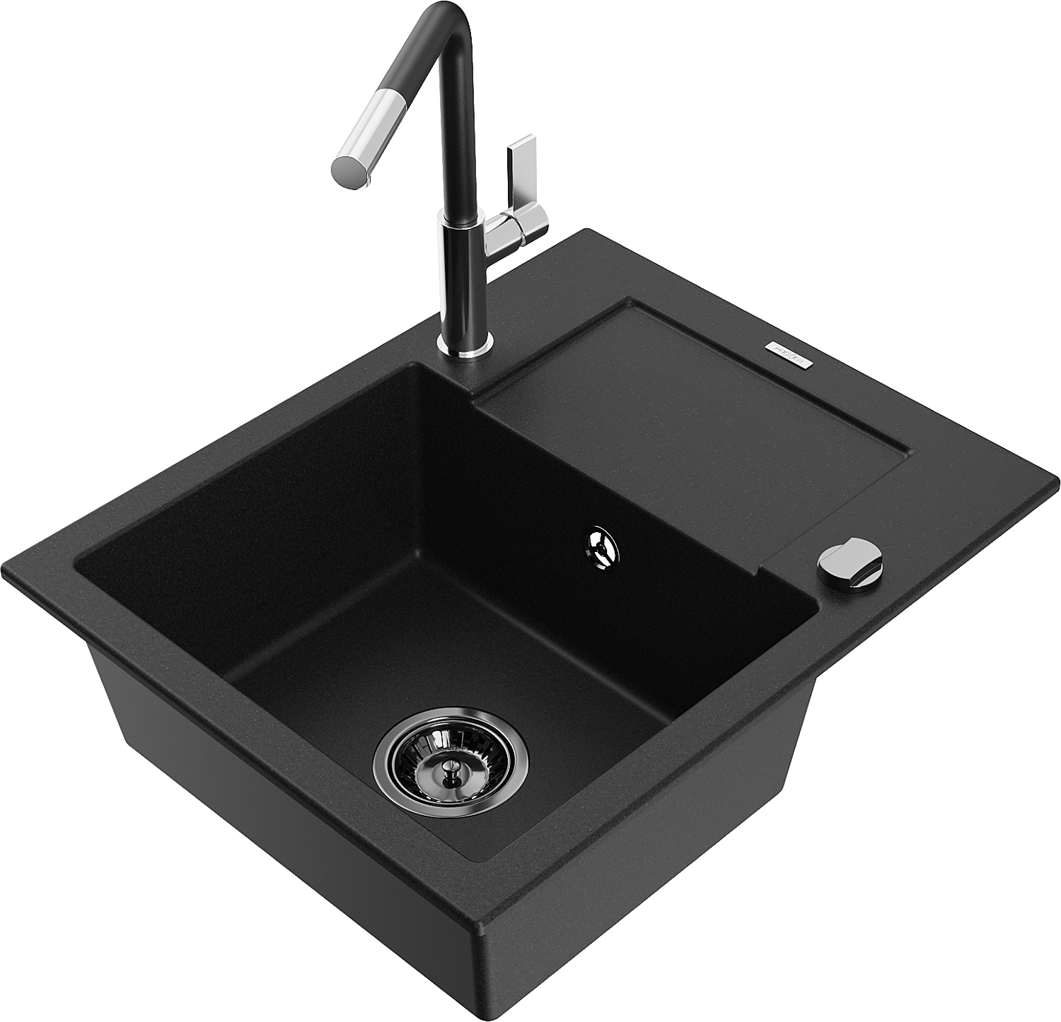 Mexen Enzo granitový kuchynský drez 1-komorový s odkvapkávačom a kuchynskou batériou Flora, čierny - 6506-77-670401-07-B