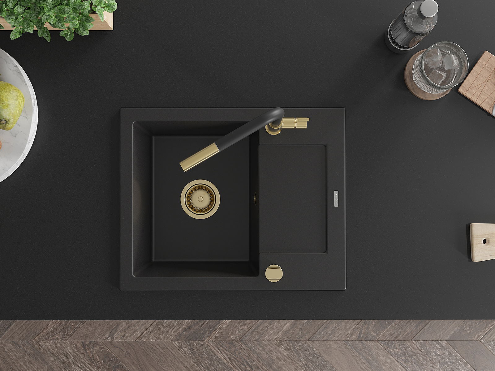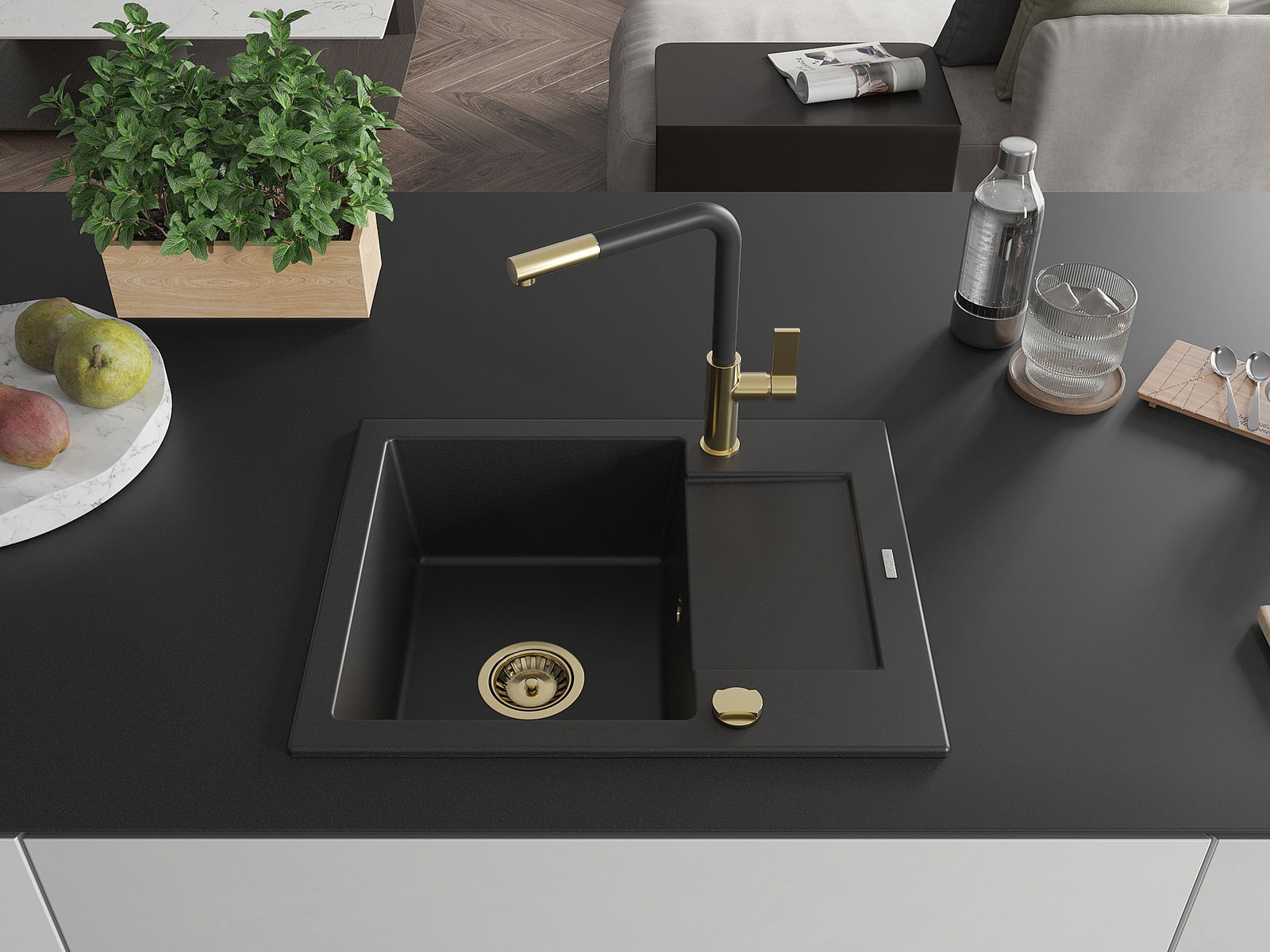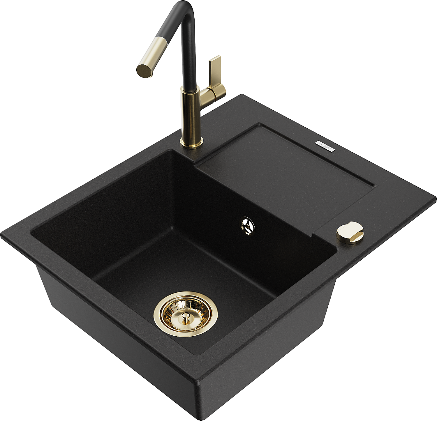 Mexen Enzo granitový drez s 1 komorou s odkvapkávačom a kuchynskou batériou Flora, čierna - 6506-77-670401-57-G