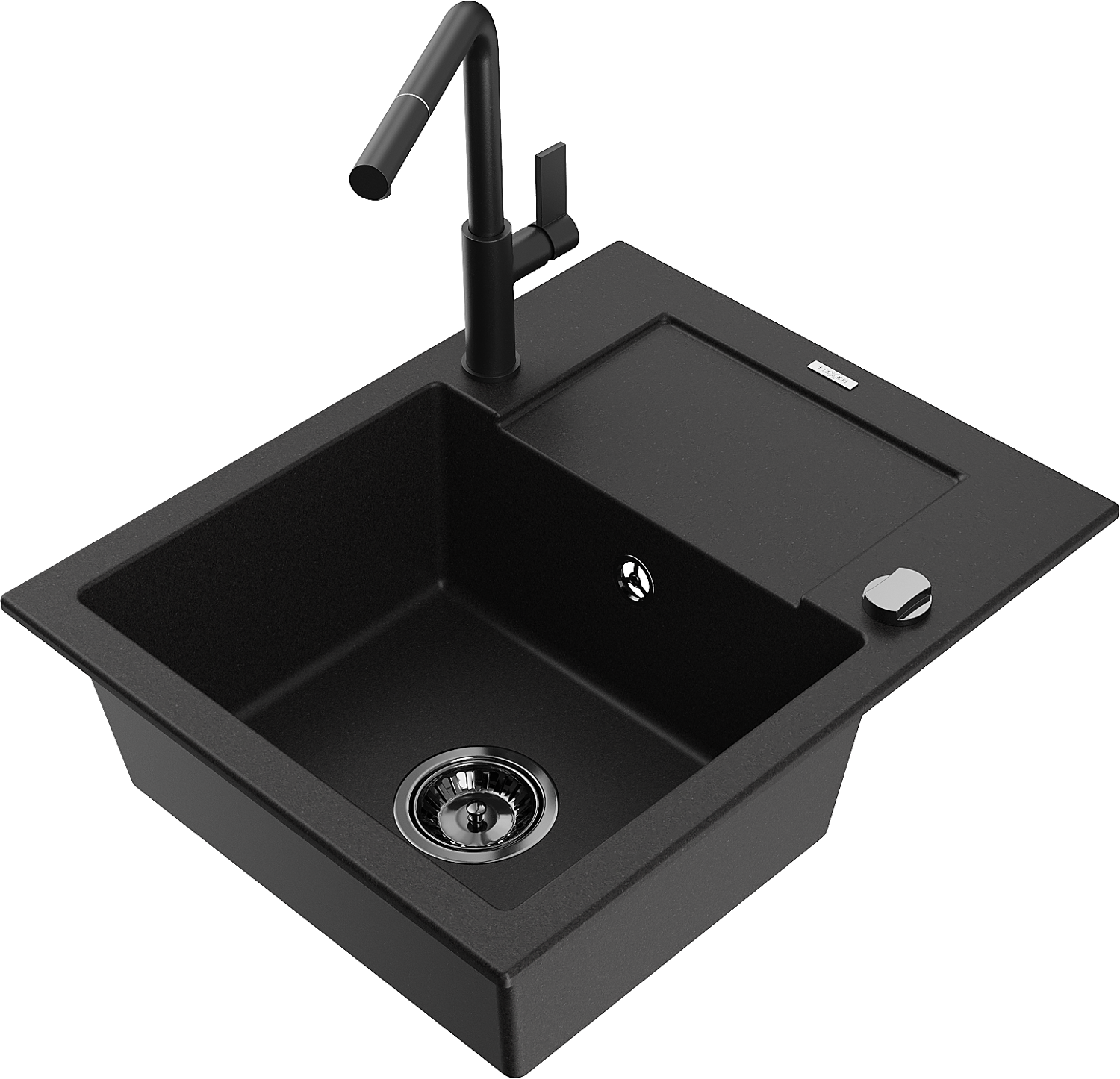 Mexen Enzo granitový drez 1-komorový s odkvapkávačom a kuchynskou batériou Flora, čierny - 6506-77-670401-70-B