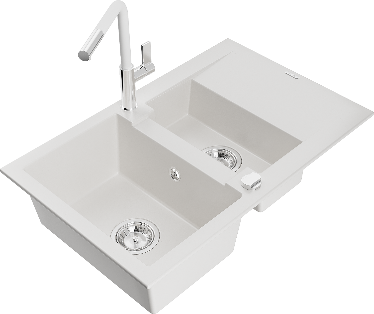 Mexen Gaspar žulový drez s 1,5 komorou, odkvapkávačom a kuchynskou batériou Flora, biela - 6507-20-670401-02