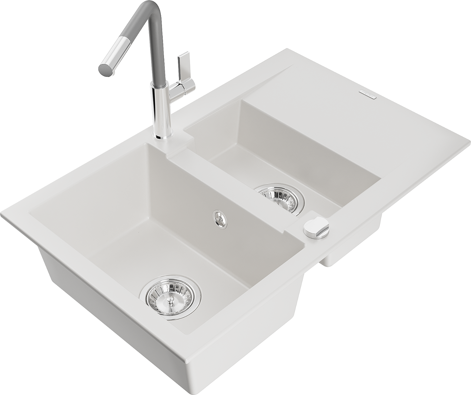 Mexen Gaspar žulový drez 1,5-komorový s odkvapkávačom a kuchynskou batériou Flora, biely - 6507-20-670401-06