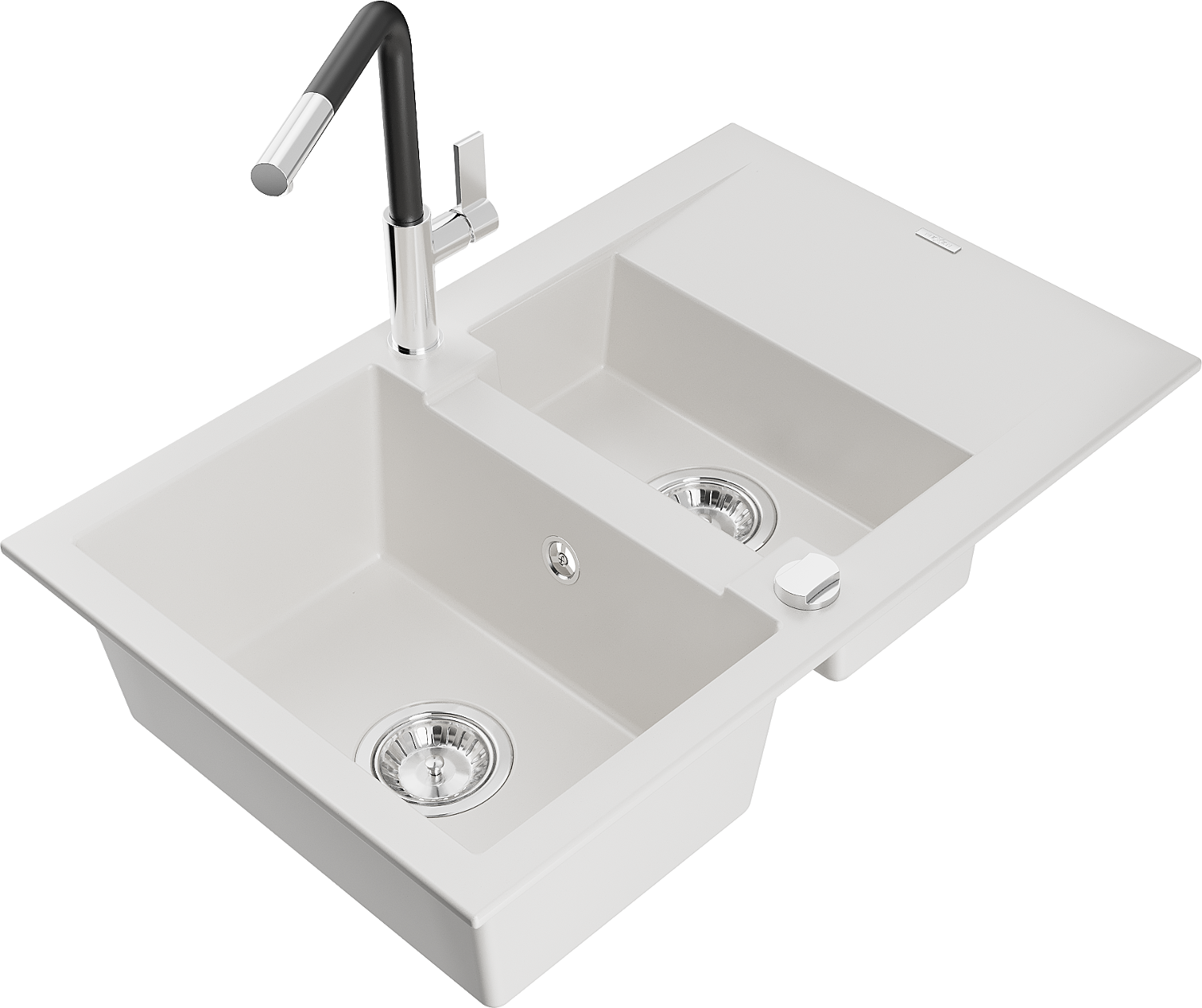 Mexen Gaspar žulový drez 1,5-komorový s odkvapkávačom a kuchynskou batériou Flora, biely - 6507-20-670401-07