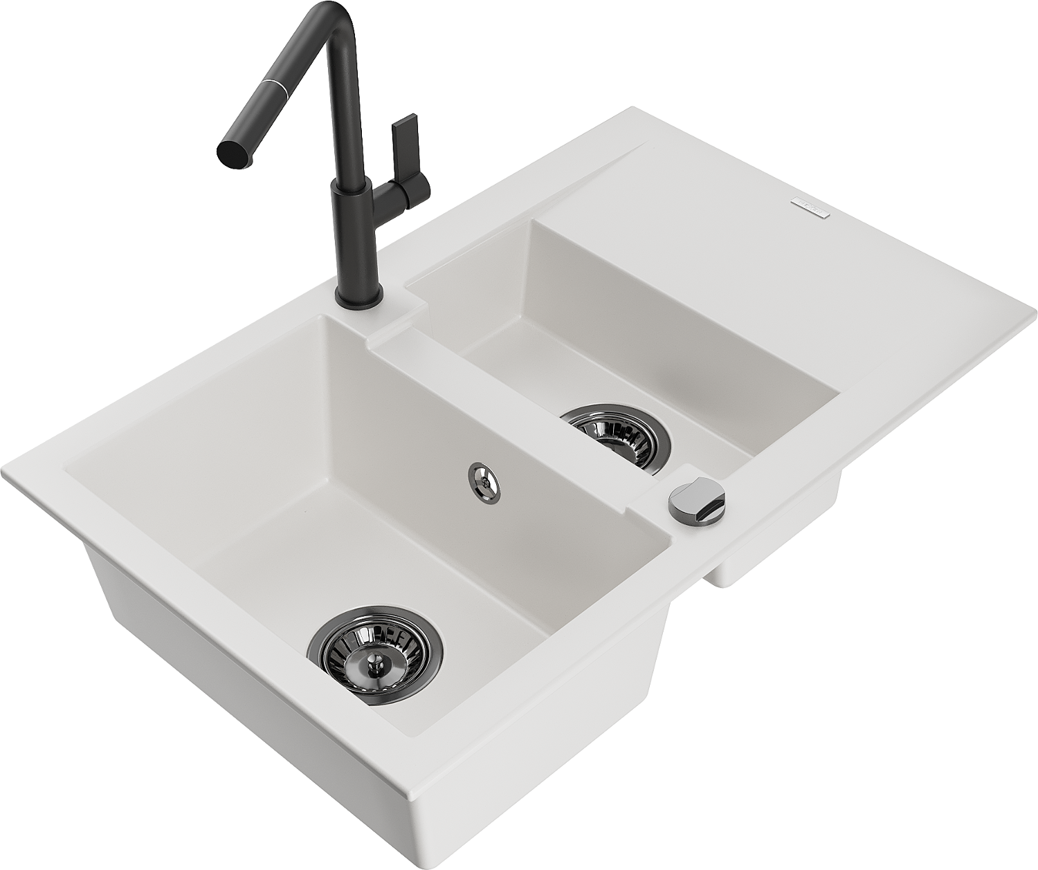 Mexen Gaspar granitový kuchynský drez 1,5-komorový s odkvapkávačom a kuchynskou batériou Flora, biely - 6507-20-670401-70-B
