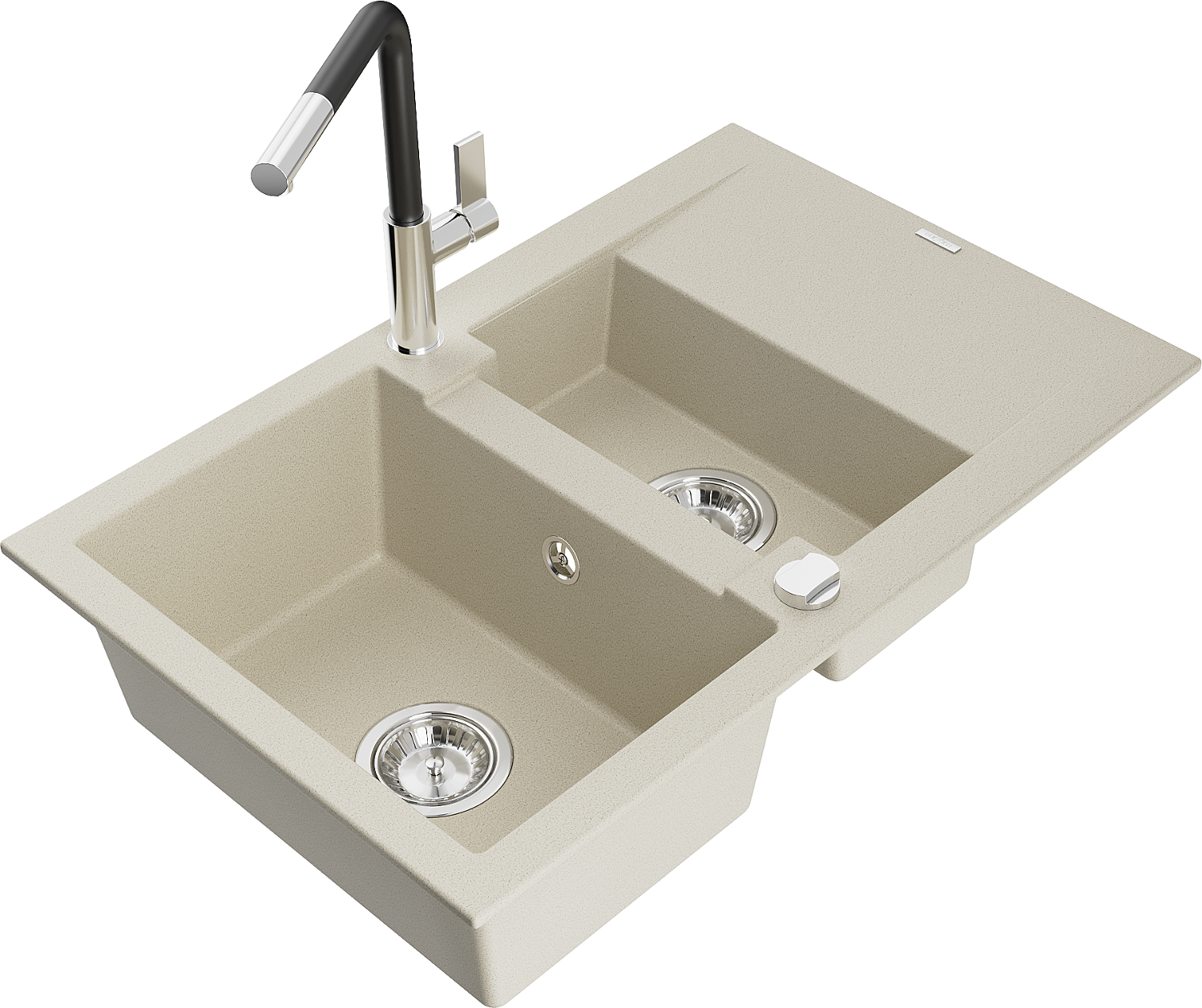 Mexen Gaspar granitový drez 1,5-komorový s odkvapkávačom a kuchynskou batériou Flora, béžový - 6507-69-670401-07