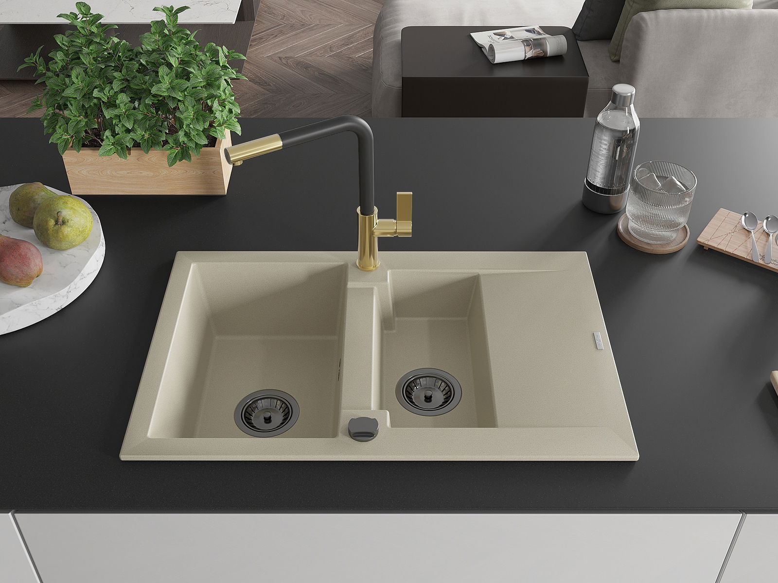 Mexen Gaspar žulový drez 1,5-komorový s odkvapkávačom a kuchynskou batériou Flora, béžový - 6507-69-670401-57-B