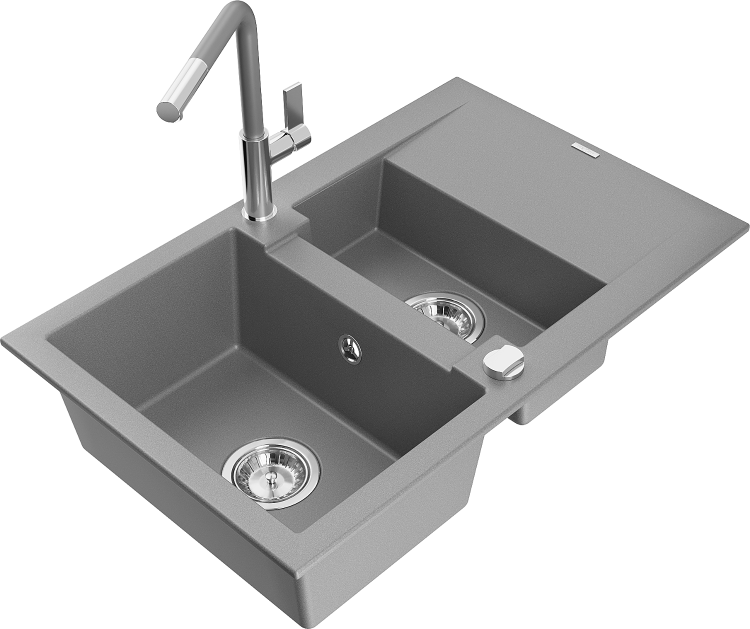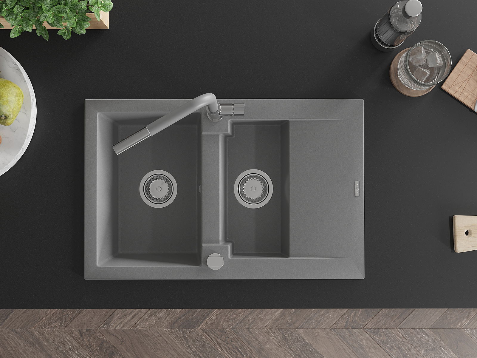 Mexen Gaspar granitový drez 1,5-komorový s odkvapkávačom a kuchynskou batériou Flora, sivý - 6507-71-670401-06
