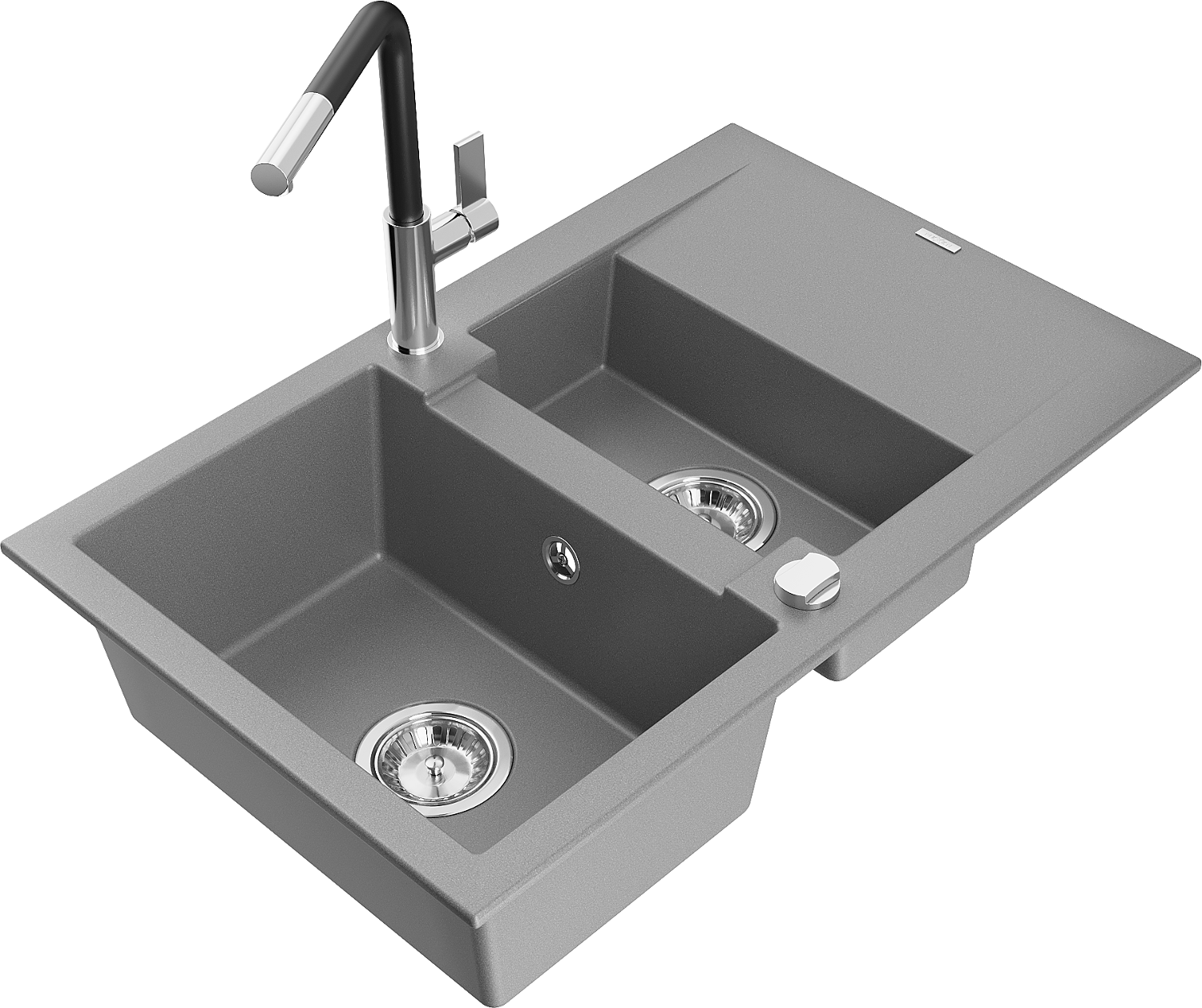 Mexen Gaspar granitový kuchynský drez 1,5-komorový s odkvapkávačom a kuchynskou batériou Flora, sivý - 6507-71-670401-07