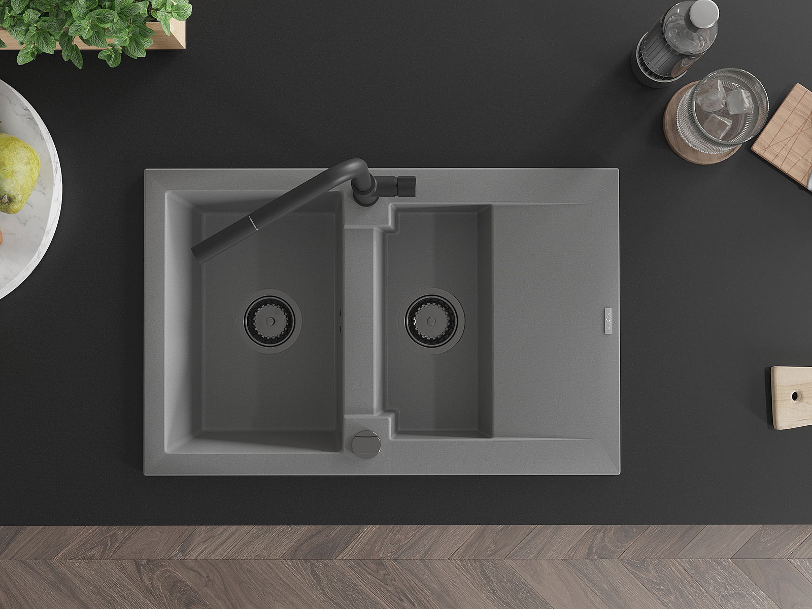 Mexen Gaspar granitový drez 1,5-komorový s odkvapkávačom a kuchynská batéria Flora, sivý - 6507-71-670401-70-B