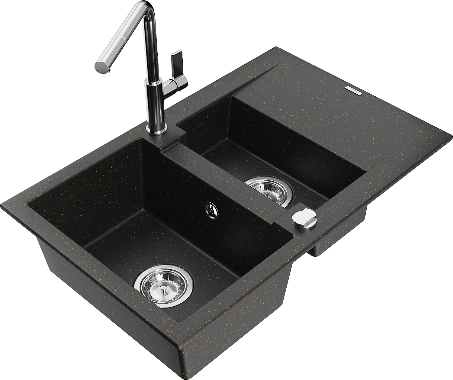 Mexen Gaspar granitový drez s 1,5 komorami s odkvapkávacou plochou a kuchynskou batériou Flora, čierny/zlatý metalik
