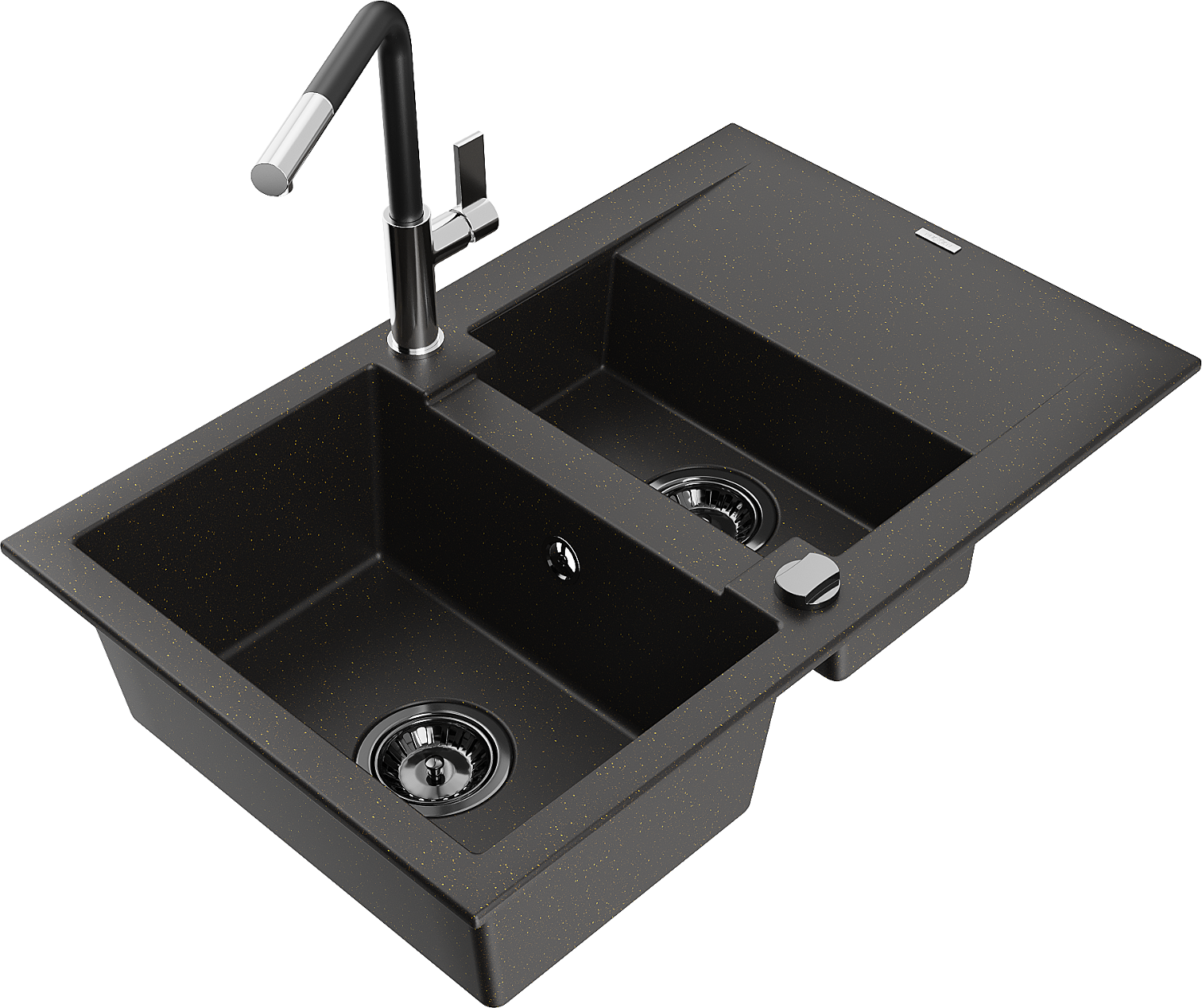 Mexen Gaspar žulový kuchynský drez 1,5-komorový s odkvapkávačom a kuchynskou batériou Flora, čierna/zlatá - 6507-75-670401-07-B