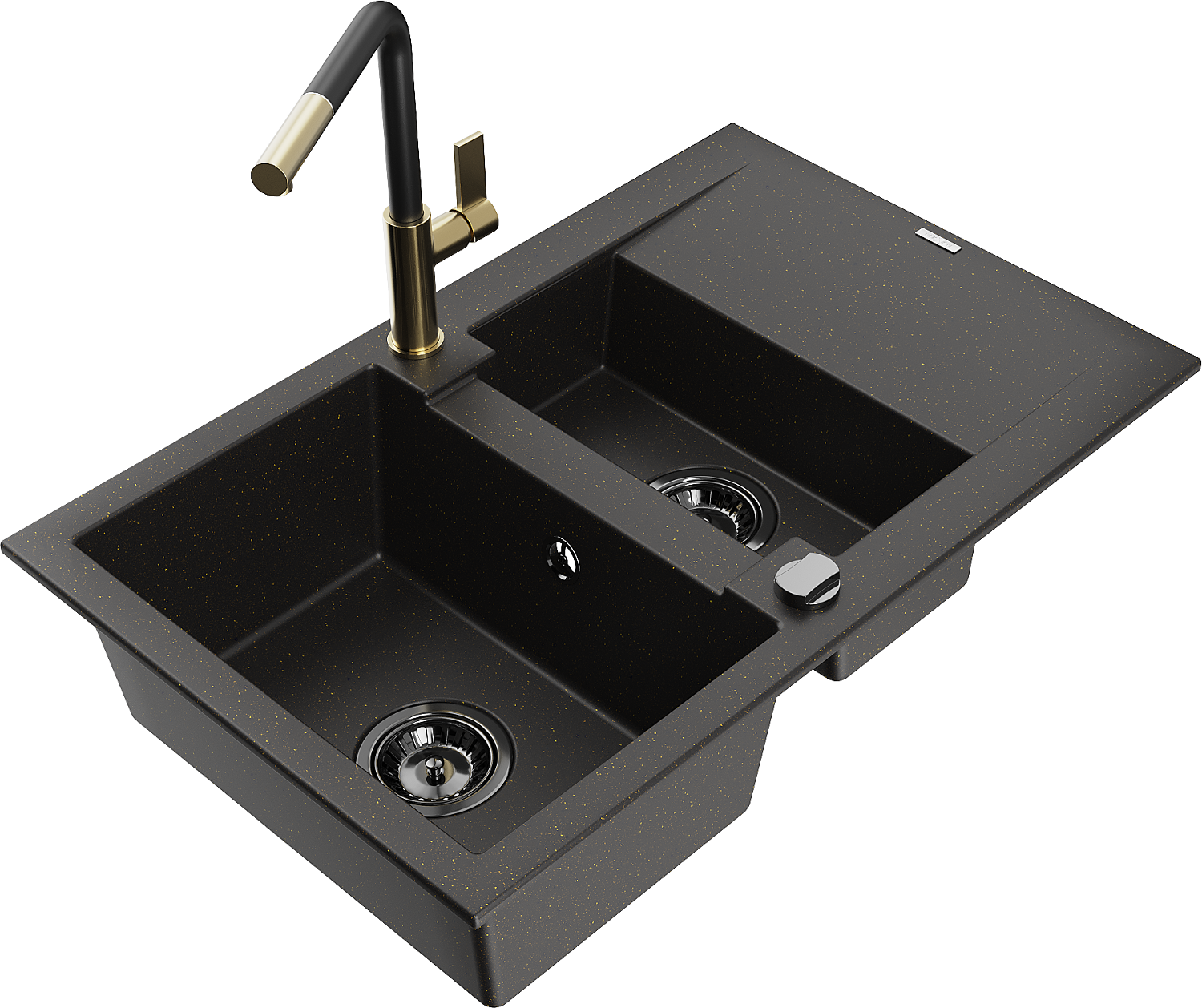Mexen Gaspar granitový drez 1,5-komorový s odkvapkávačom a kuchynskou batériou Flora, čierny/zlatý - 6507-75-670401-57-B