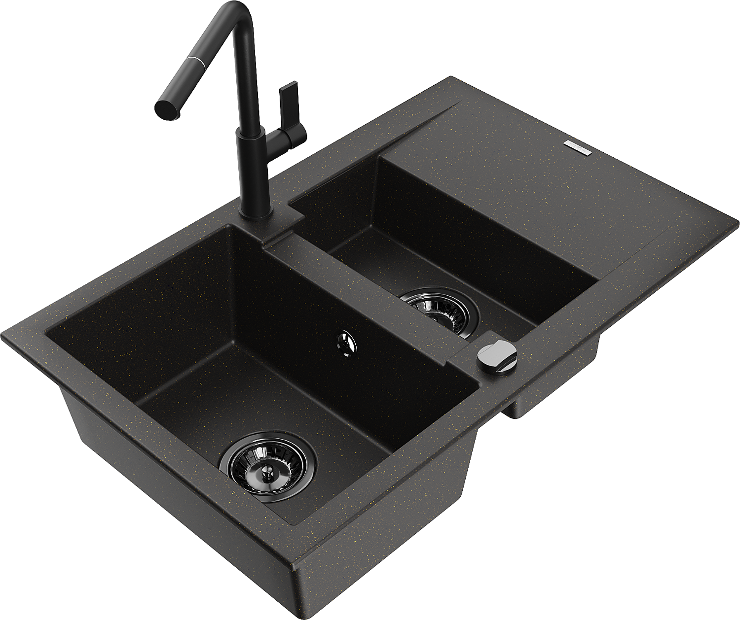 Mexen Gaspar žulový drez s 1,5 komorou s odkvapkávačom a kuchynskou batériou Flora, čierny/zlatý - 6507-75-670401-70-B