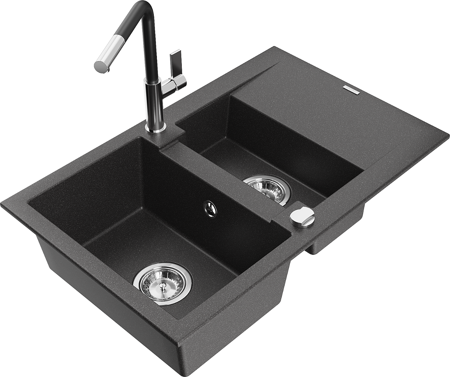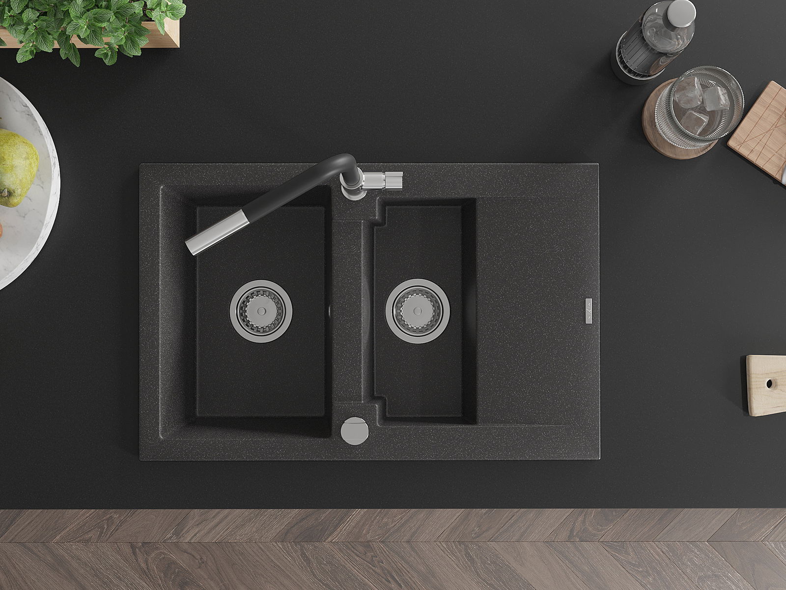Mexen Gaspar žulový drez 1,5-komorový s odkvapkávačom a kuchynskou batériou Flora, čierny posýpaný - 6507-76-670401-07
