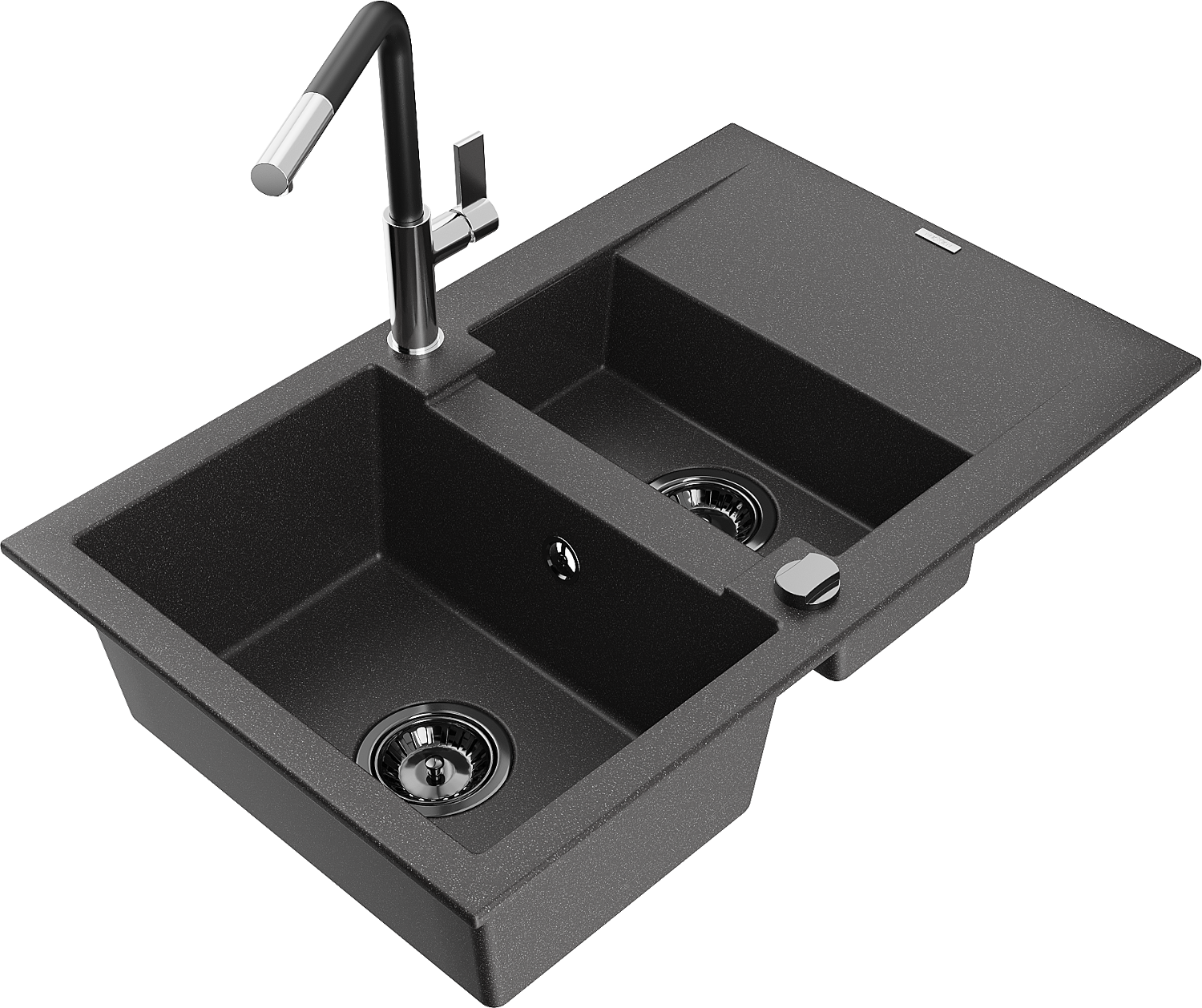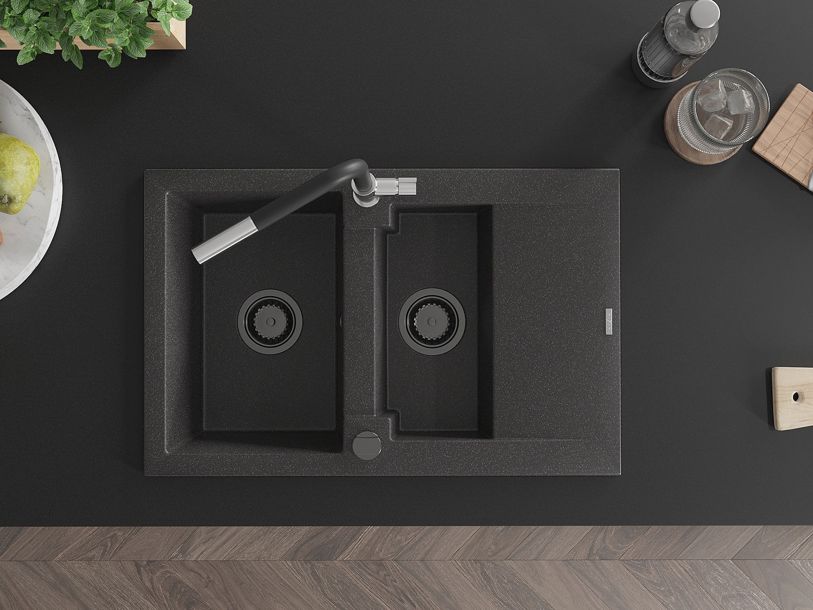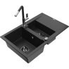 Mexen Gaspar žulový drez 1,5-komorový s odkvapkávačom a kuchynskou batériou Flora, čierny škvrnitý