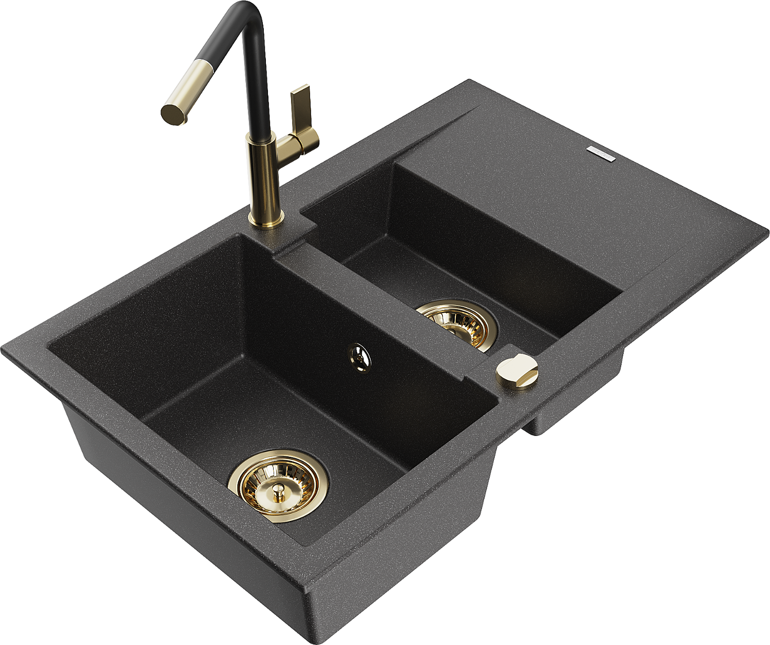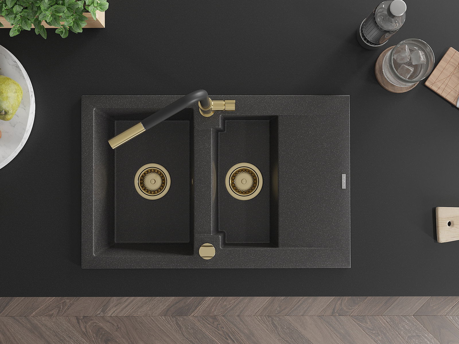 Mexen Gaspar granitový drez 1,5-komorový s odkvapkávačom a kuchynskou batériou Flora, čierny bodkovaný - 6507-76-670401-57-G
