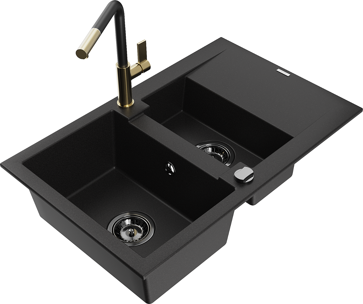 Mexen Gaspar žulový drez 1,5-komorový s odkvapkávačom a kuchynskou batériou Flora, čierny - 6507-77-670401-57-B