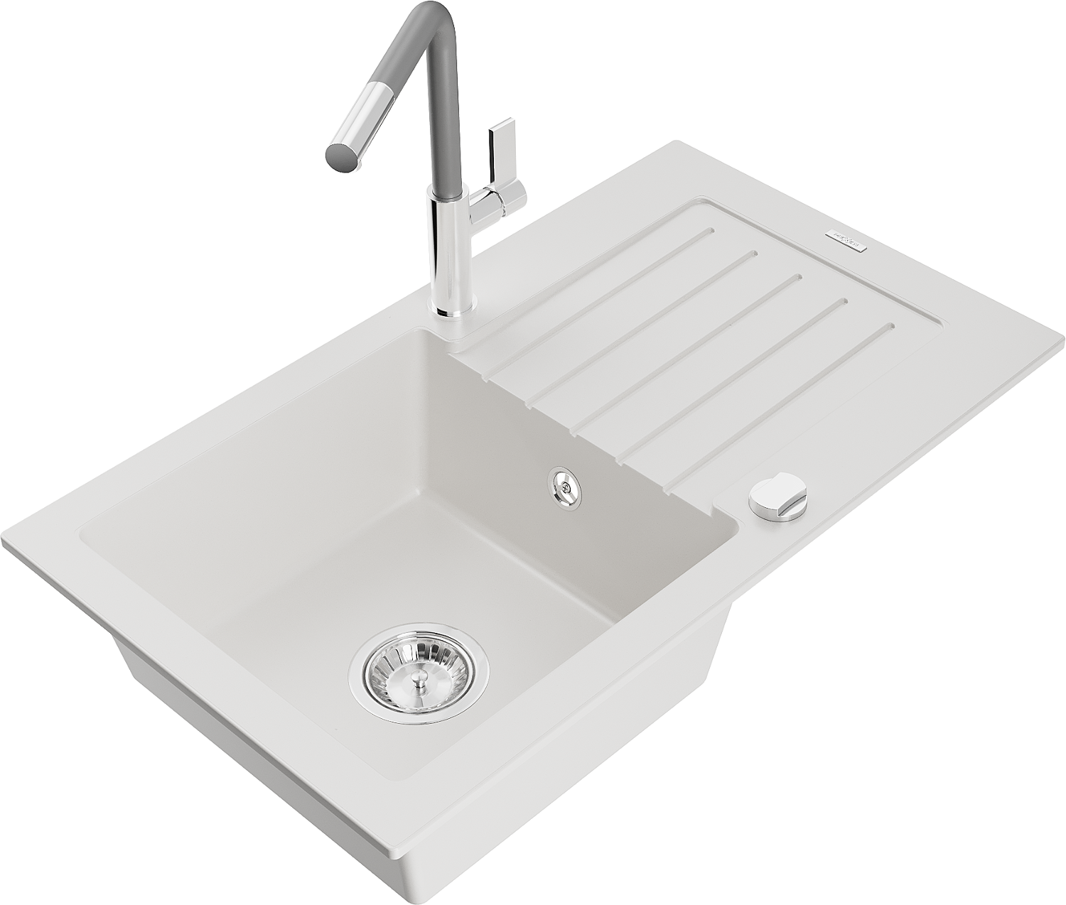 Mexen Pablo granitový drez s 1 komorou, odkvapkávačom a kuchynskou batériou Flora, biely - 6510-20-670401-06