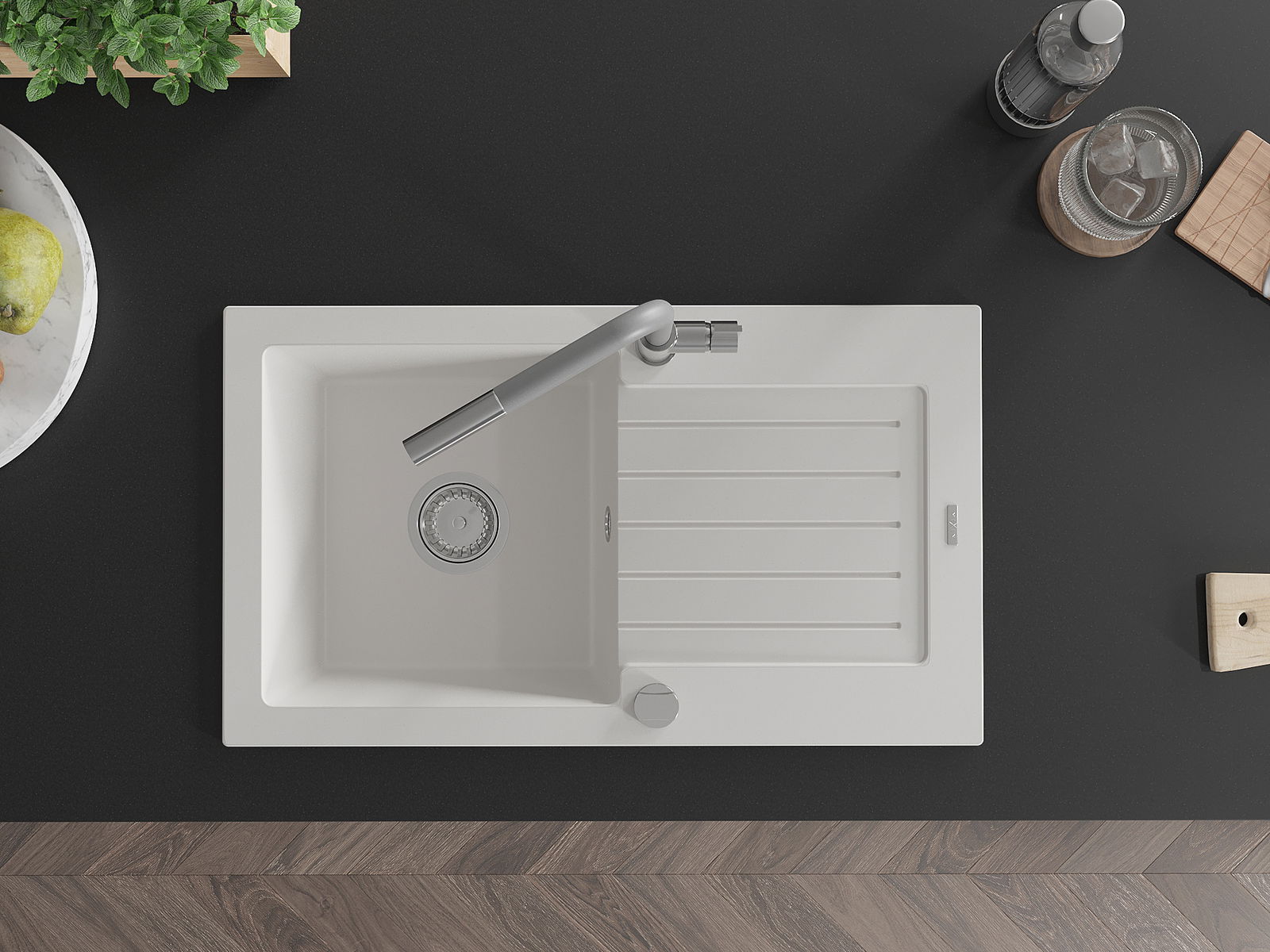 Povrch umývadla je odolný voči škvrnám a sfarbeniu, vďaka čomu sa ľahko čistí a zachováva si svoju farbu po dlhú dobu. Estetický a prakticky dopĺňajúci každú kuchyňu.
