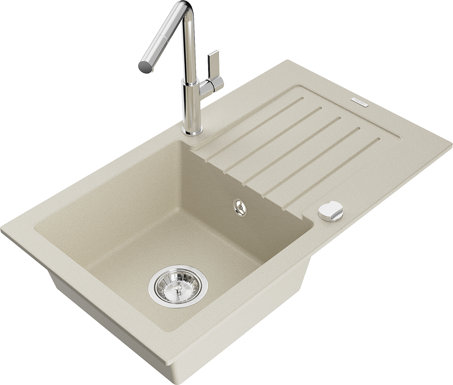 Mexen Pablo granitový kuchynský drez 1-komorový s odkapávačom a kuchynskou batériou Flora, béžový - 6510-69-670401-00