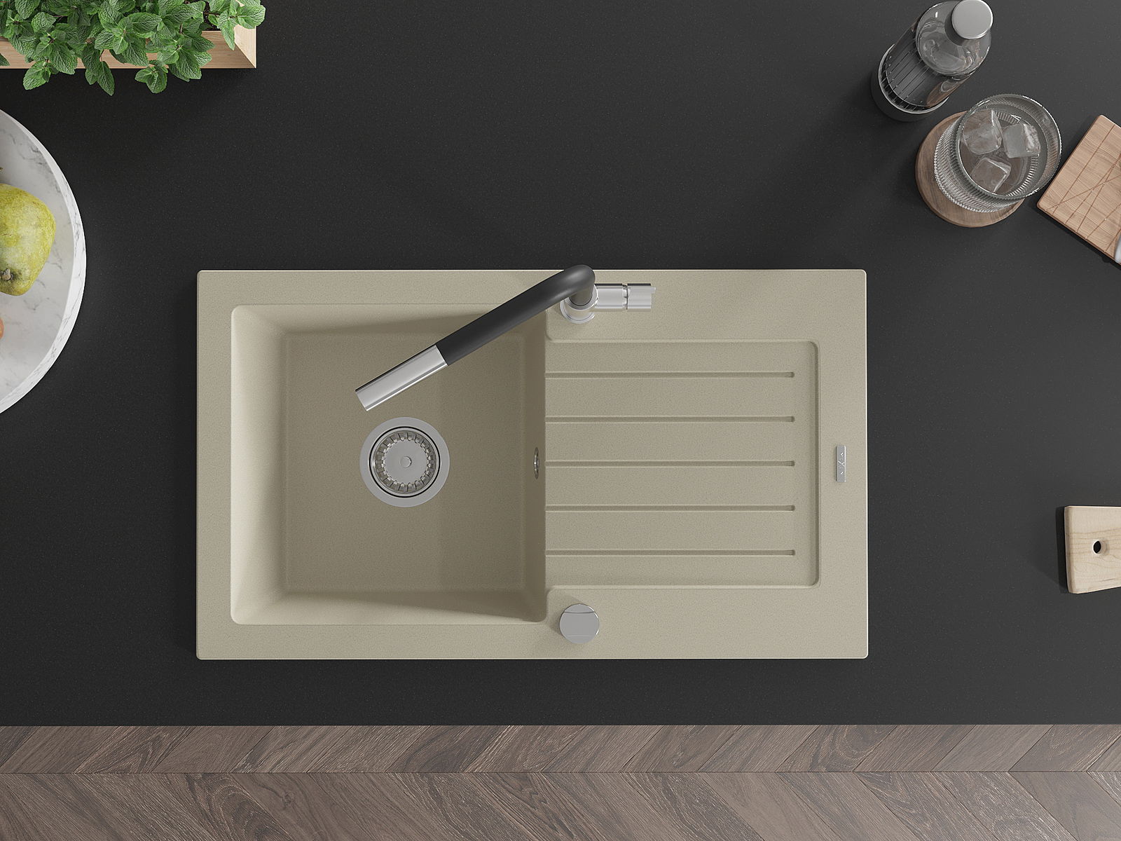 Mexen Pablo granitový jednodrez s odkvapkávačom a kuchynská batéria Flora, béžová - 6510-69-670401-07