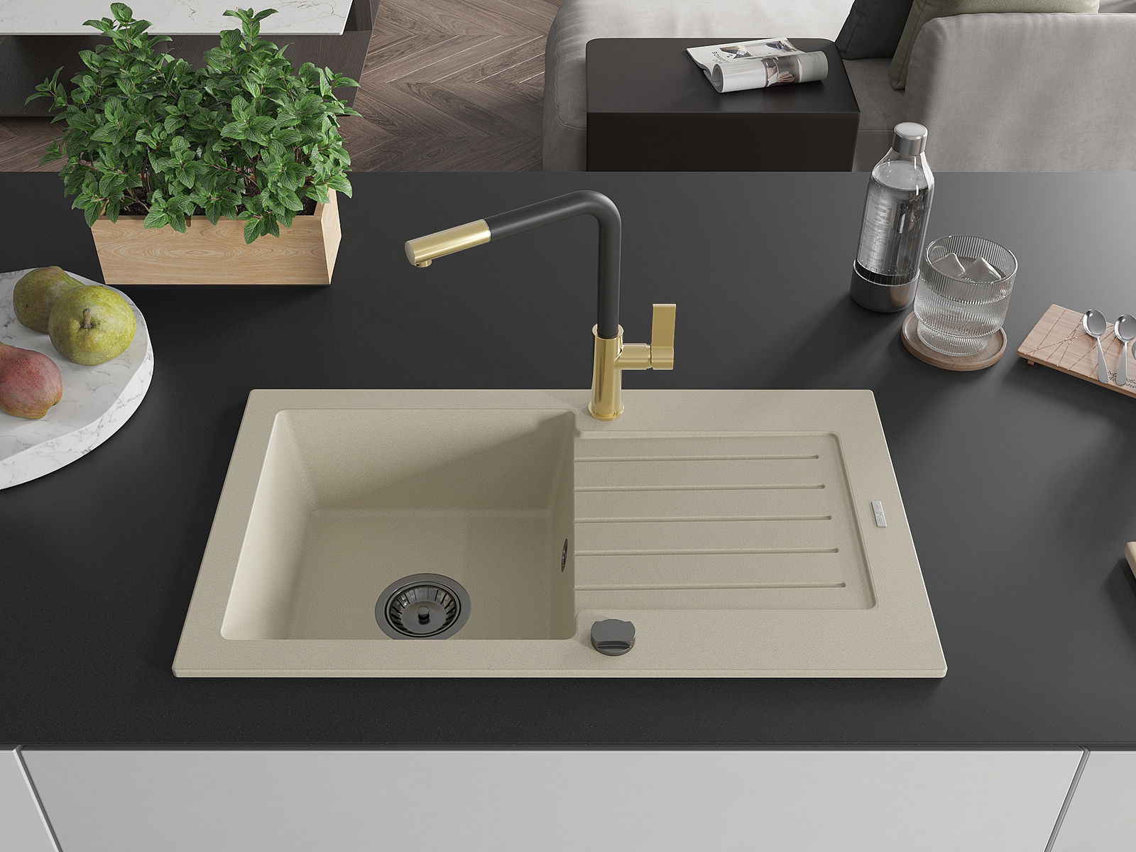 Mexen Pablo granitový kuchynský drez s 1 komorou a odkvapkávačom a kuchynskou batériou Flora, béžový - 6510-69-670401-57-B