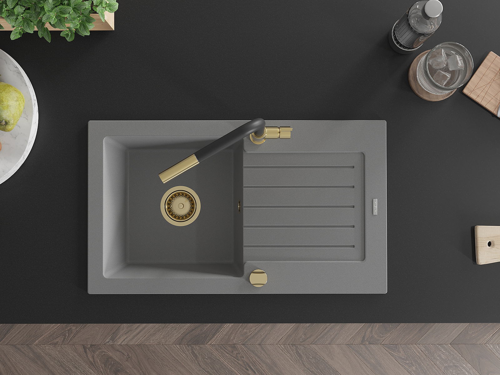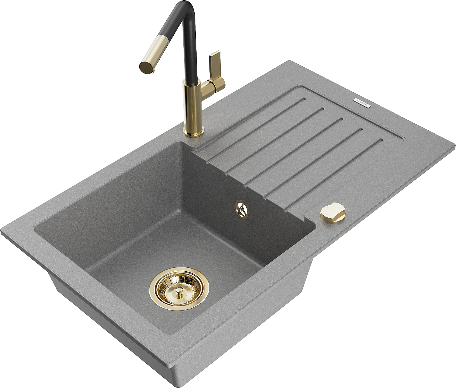 Mexen Pablo žulový drez s 1 komorou, odkvapkávačom a kuchynskou batériou Flora, šedá - 6510-71-670401-57-G