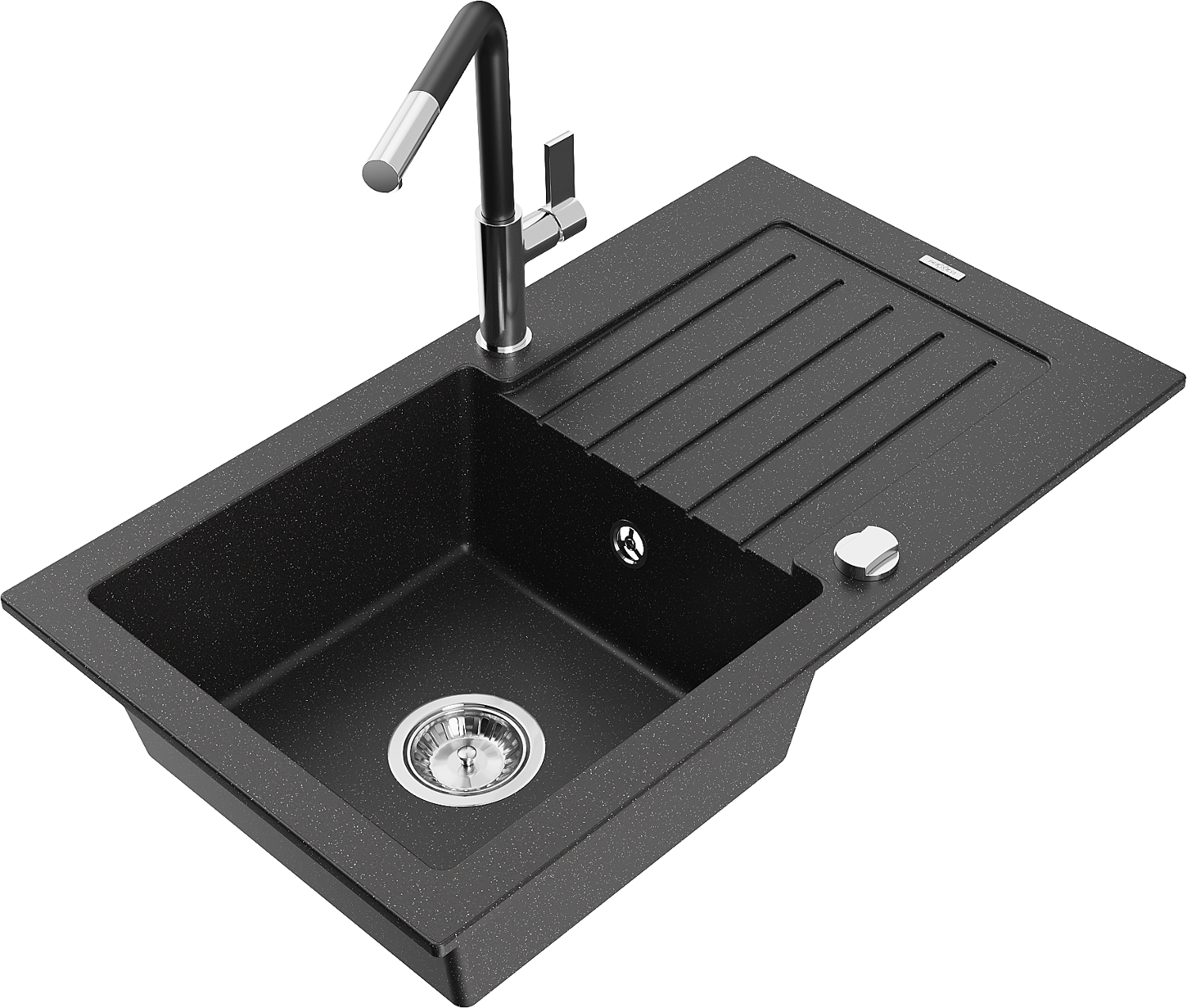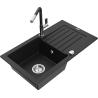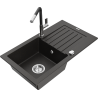 Mexen Pablo žulový drez s jednou komorou, odkvapkávacou plochou a kuchynskou batériou Flora, čierny/sivý metalik
