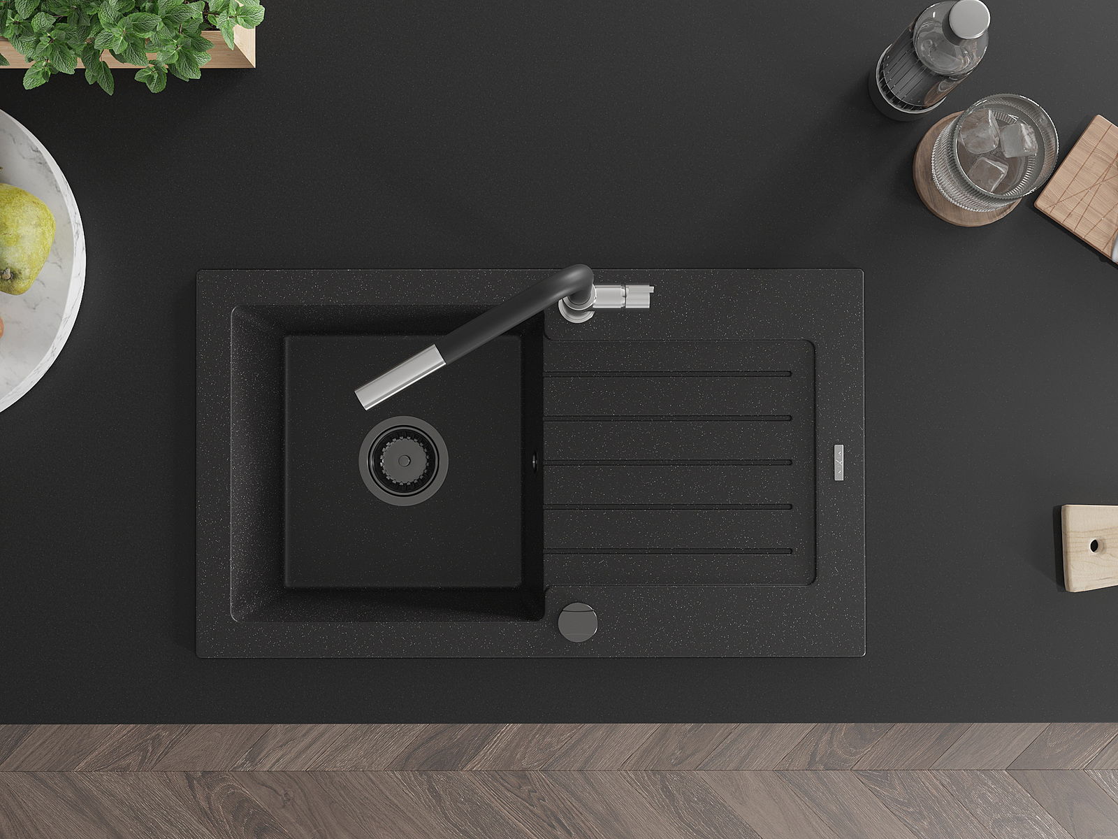 Povrch kuchynského drezu je odolný voči škvrnám a zafarbeniu, vďaka čomu sa ľahko udržiava a zachováva svoju farbu počas dlhého obdobia používania. Estetický a praktický doplnok pre každú kuchyňu.