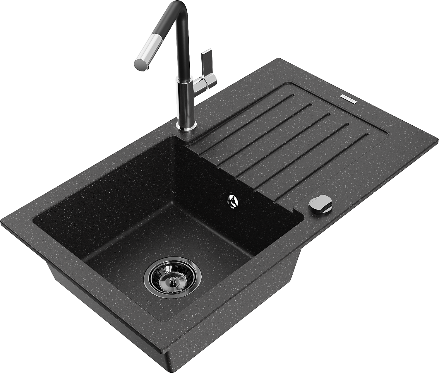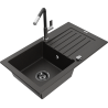 Mexen Pablo granitový drez s 1 komorou, odkvapkávačom a kuchynskou batériou Flora, čierny/strieborný metalik