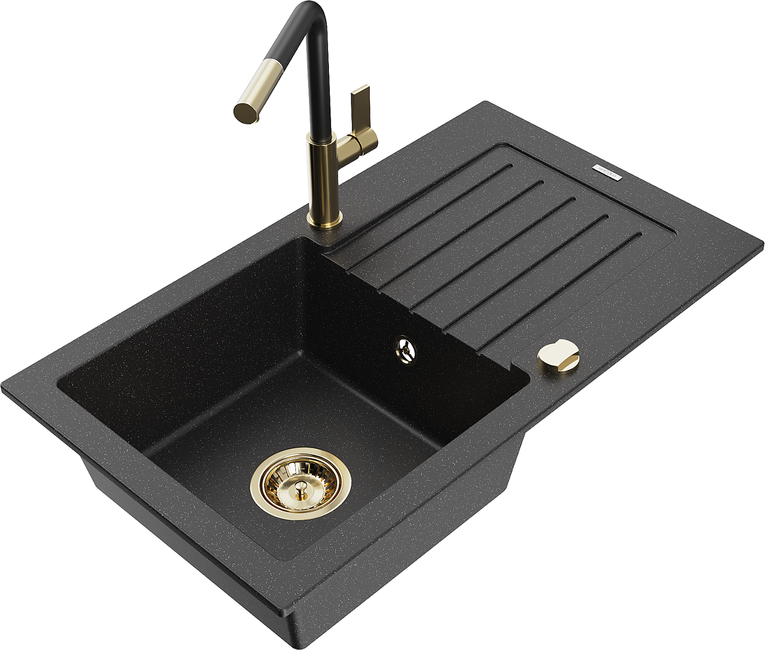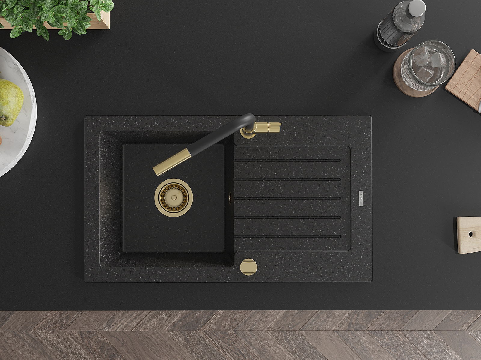 Mexen Pablo granitový drez s 1 komorou, odkvapkávačom a kuchynskou batériou Flora, čierny/strieborný metalik